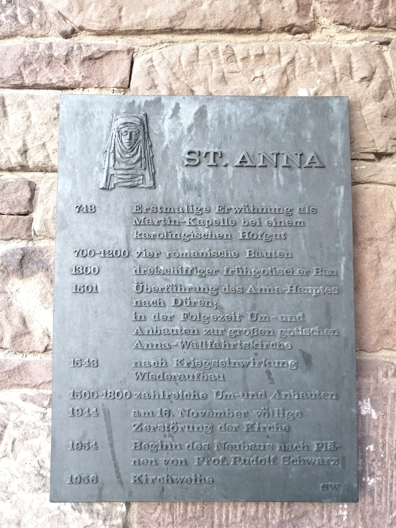 Der verheerende Bombenangriff der britischen Luftwaffe zerstörte die gotische Annakirche am 16. November 1944 mit ihrem fast einhundert Meter hohen Kirchturm fast vollständig. Der Architekt Rudolf Schwarz fertigte zwischen 1954 und 1956 auf den Überresten das inzwischen siebte Kirchengebäude an. Hierbei wurden alte Trümmerteile in das neue Kirchengebäude integriert. Heute gehört das Gebäude der Annakirche zu einem der bedeutendsten Werke der Nachkriegsmoderne in Deutschland. Die Dürener Annakirche war am Anfang dem heiligen Martin geweiht und erst später der heiligen Anna. Eine Kapelle wurde in Düren bereits im Jahr 748 von Gelehrten erwähnt. Aus dieser Kapelle entwickelte sich anschließend die Martinskirche. Der Steinmetz Leonard aus Kornelimünster bei Aachen bescherte der Stadt Düren mit der Entführung der Anna-Reliquie eine ganz besondere Geschichte: Leonard brachte im Jahr 1501 die Überreste aus der Stiftskirche St. Stephan in Mainz über Umwege in unsere Stadt. Die vier Bronze-Glocken im Turm sind auf die Heiligennamen Maria, Joseph, Anna und Martin geweiht. Regelmäßig finden Führungen in der Annakirche statt.
