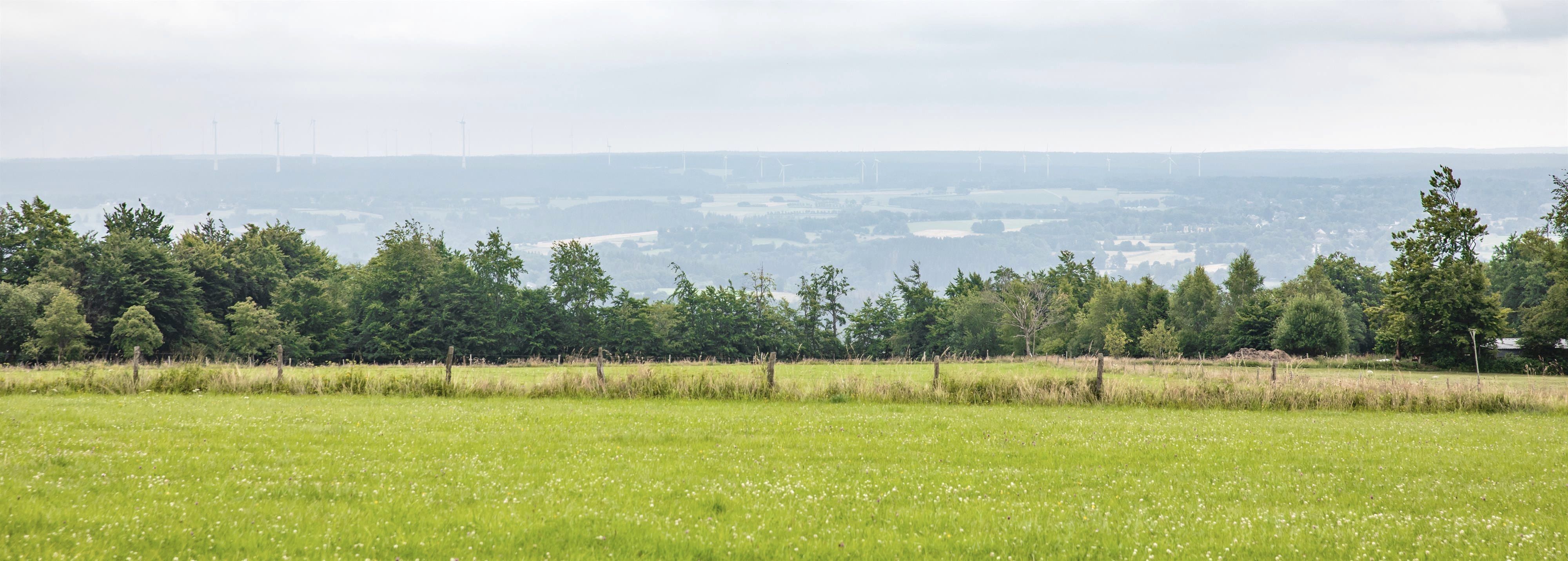 Im Vordergrund durchziehen zahlreiche Flurhecken das "Monschauer Heckenland". Sie dienten in der Vergangenheit der Umzäunung der Grundstücke und schützen seit alters her Äcker und Weidevieh vor den starken Westwinden.