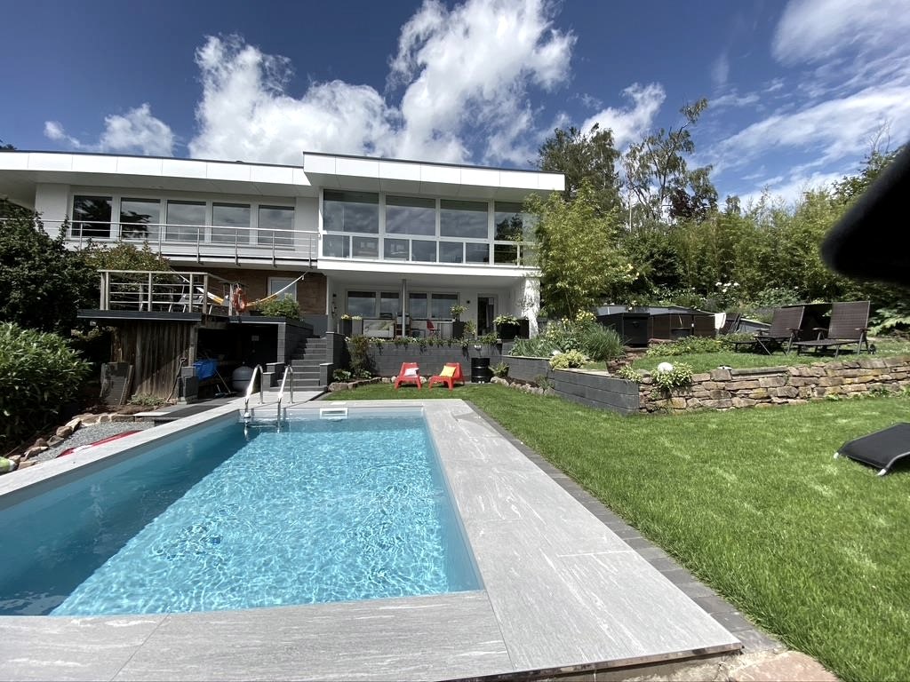 Unser Flachdachbungalow, im Bauhaus-Stil, liegt in einer ruhigen Sackgasse direkt am Waldrand. Durch die wunderschöne Hanglage schweift der Blick ungehindert vom Pool und großem Garten, über das bewaldete Tal hinüber zur Altstadt und der Nideggener Burg. Die obere Etage bewohnen wir; dort sind auch unsere Büros. Die unteren Etagen haben wir, nach dem Auszug unserer Kinder, nun für unsere Urlaubsgäste aus-, bzw. umgebaut.