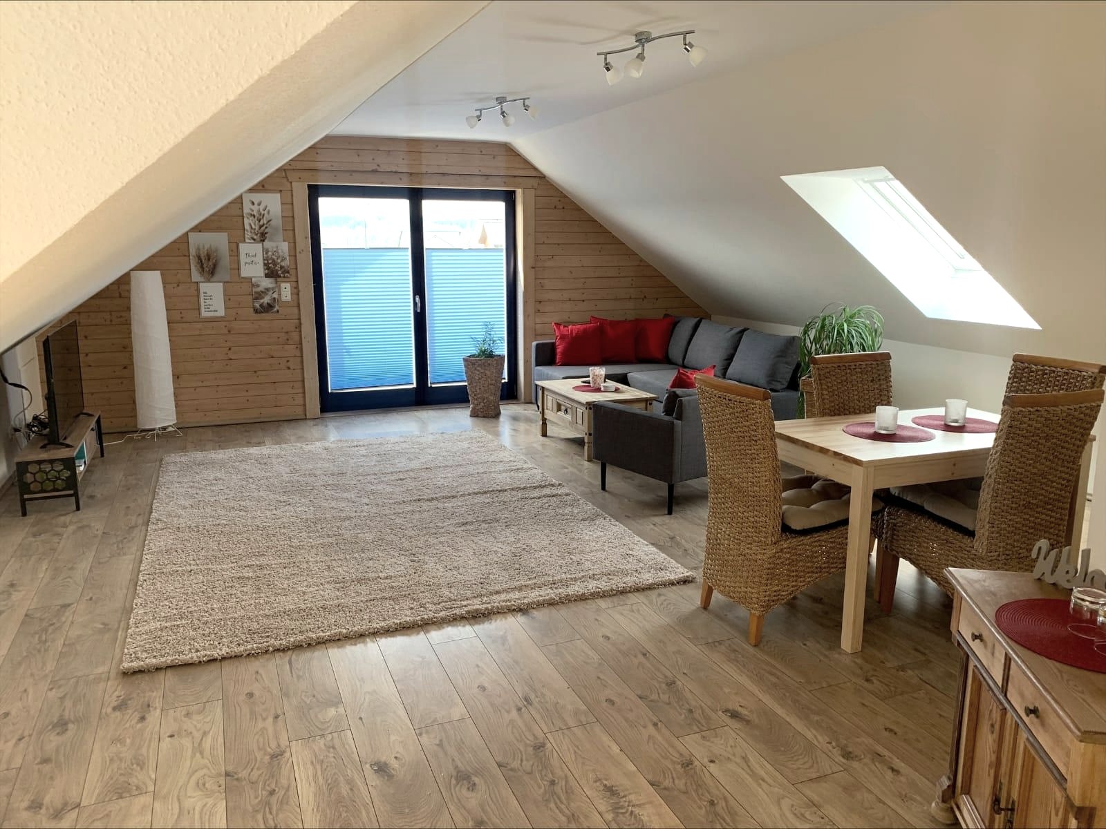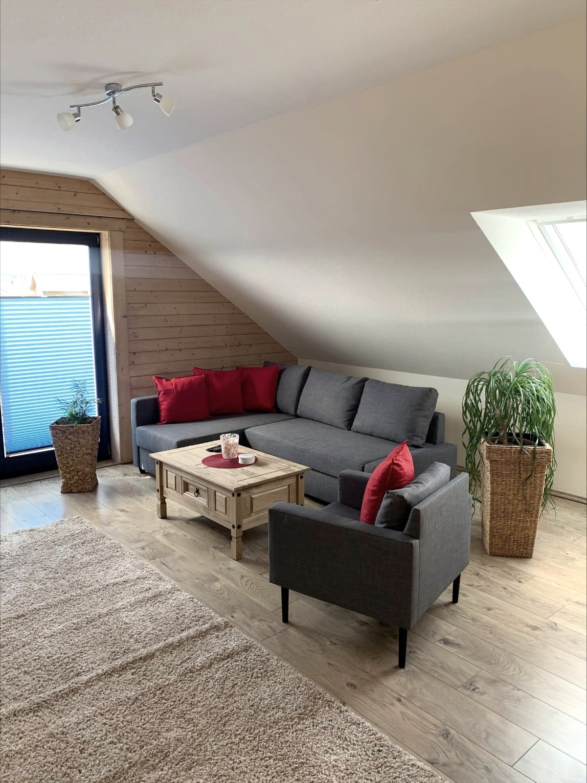 Unsere 80qm große Fewo bietet einen offenen Koch-Ess-Wohnbereich, ein Schlafzimmer, ein Bad, sowie eine 40qm große Sonnenterasse mit herrlichem Ausblick. Im Schlafzimmer befindet sich ein Doppelbett und ein Kinderbett, im Wohnzimmer ein Schlafsofa.