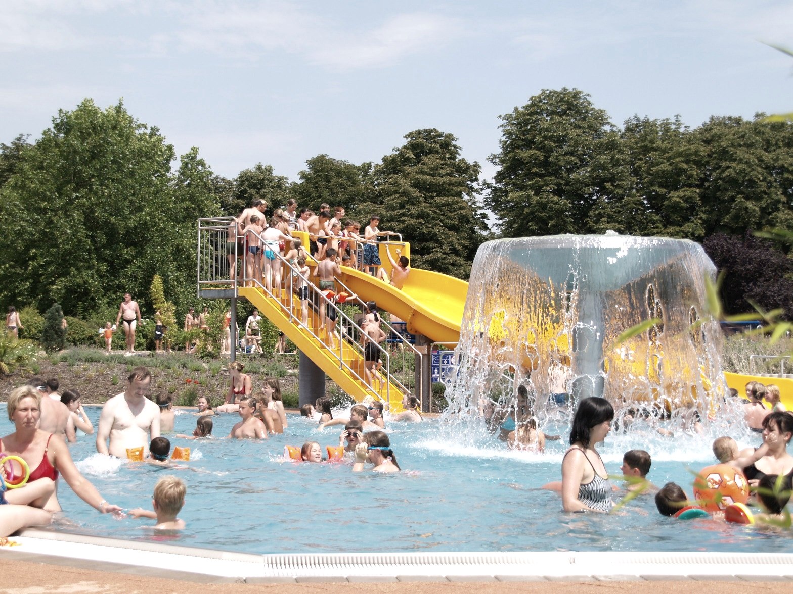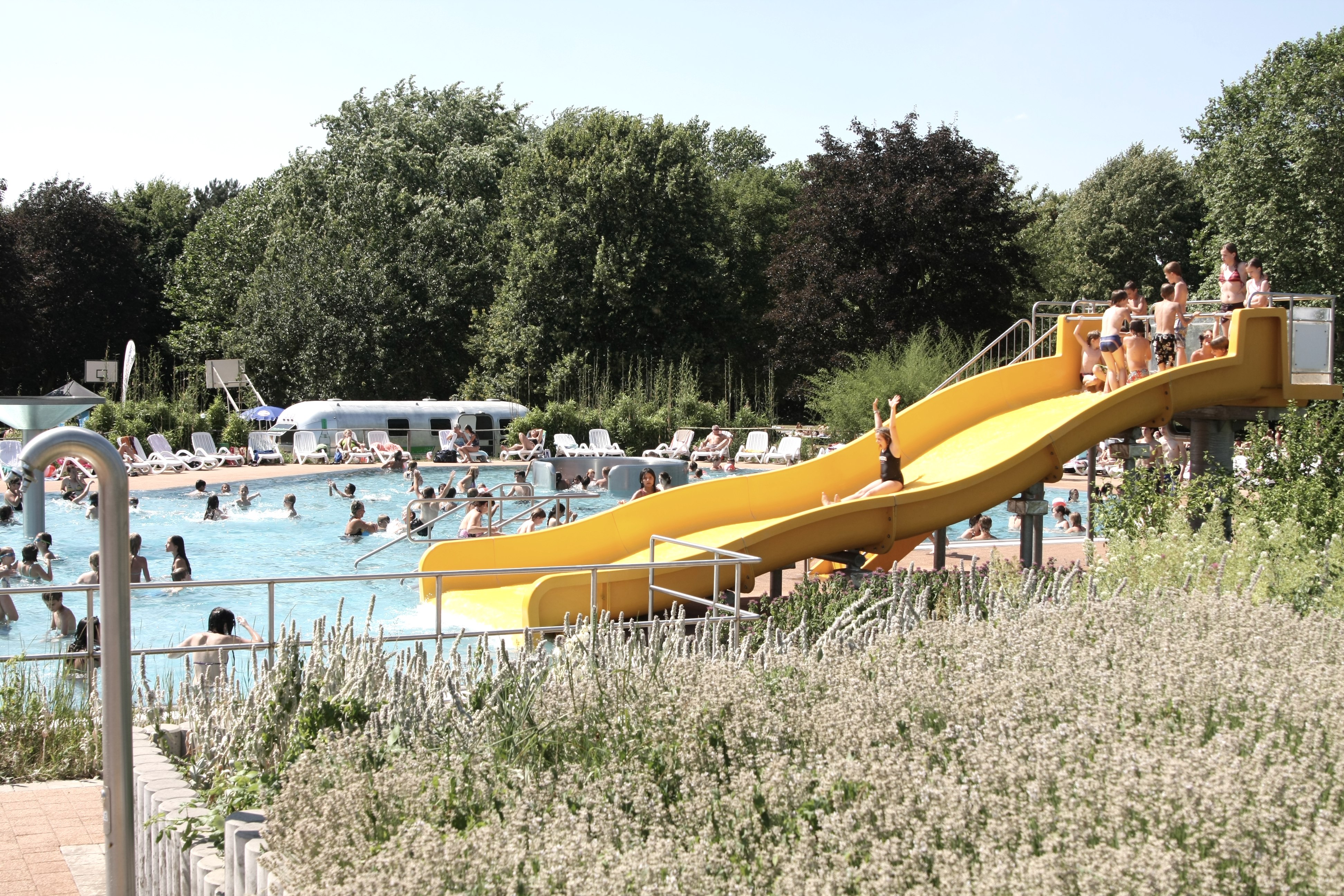 Für die Gäste stehen ein 50 Meter langes Sportbecken, ein 450 Quadratmeter großes Nichtschwimmerbecken mit Breitrutsche, ein Kleinkinderbereich und ein Sprungbecken mit fünf Meter hohen Sprunganlage zur Verfügung.