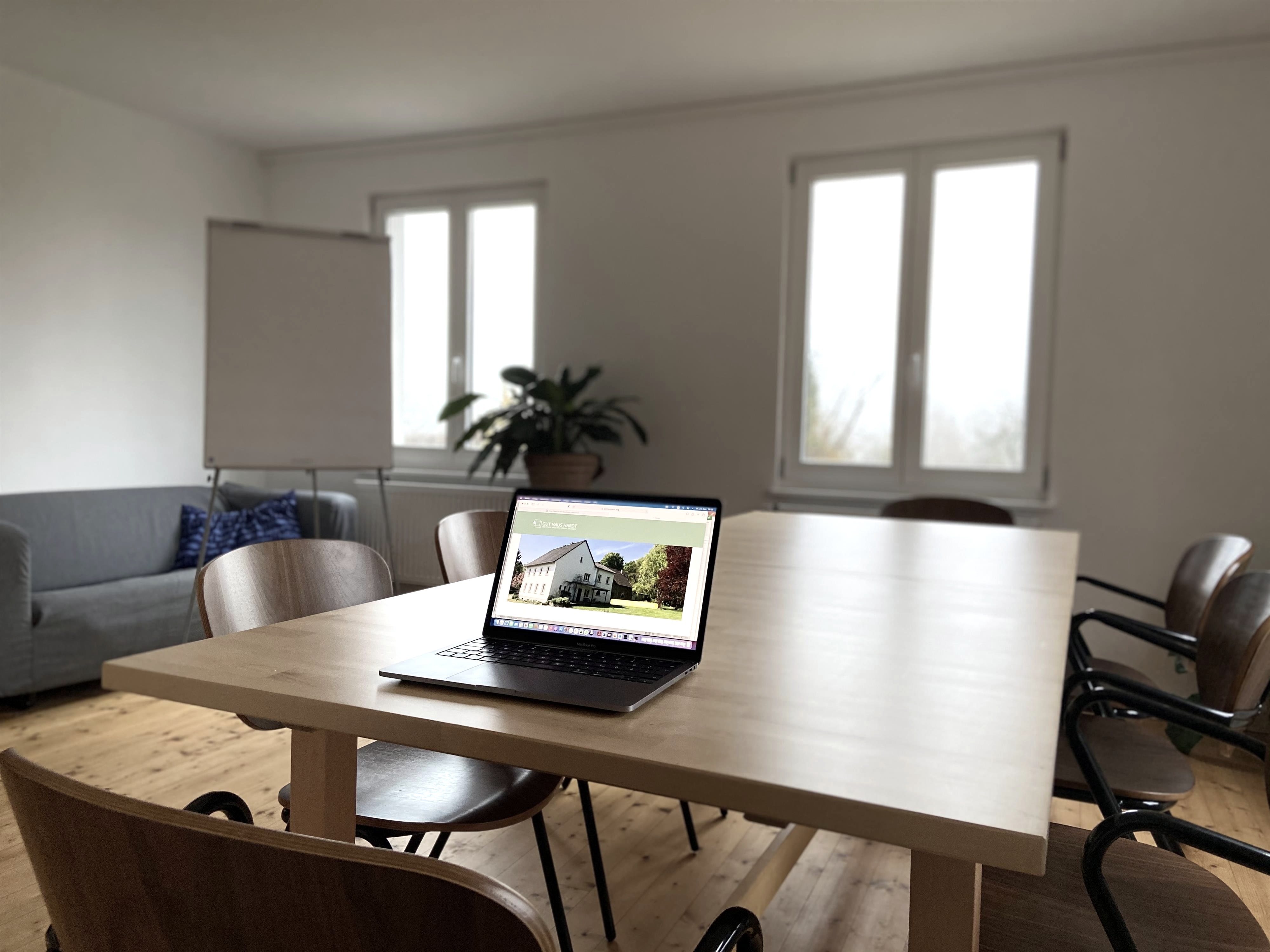 Der Meetingraum befindet sich im Erdgeschoss von Gut Haus Hardt. Durch die 4 Fenster und den alten Holzdielenboden ist der Raum sehr hell und hat eine einladende und warme Atmosphäre. Der Raum selbst, die angerenzende Gemeinschaftsküche, die während der Anmietung mitgenutzt werden kann, sowie das WC sind barrierefrei erreichbar.