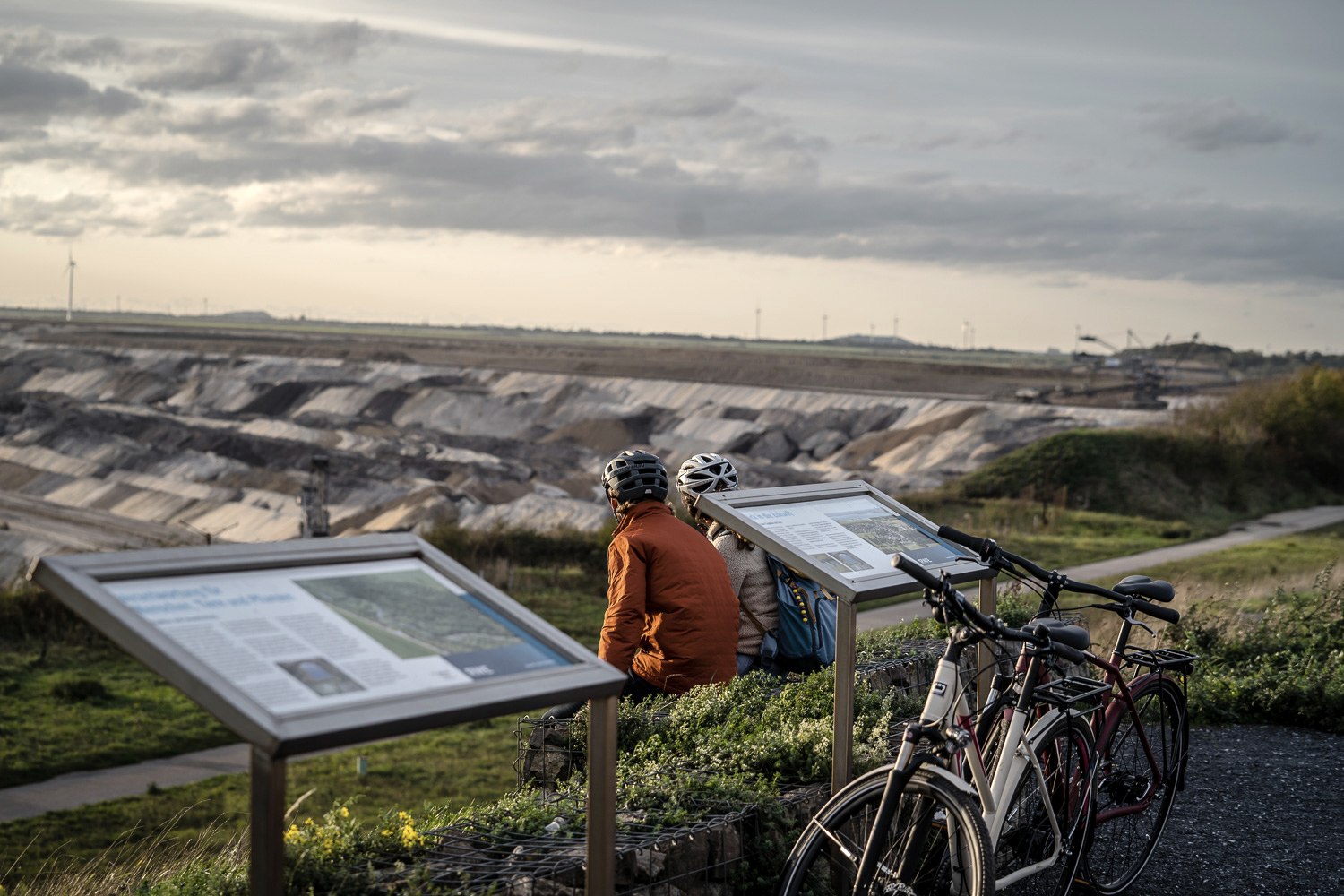 Wenn wir die Autobahnbrücke passiert haben, eröffnet sich der Blick auf die mächtige Tagebaulandschaft. Die Radtour verläuft zunächst ein Stück an der Autobahn entlang und führt über den Lucherberger See weiter nach Inden, wo es einen Aussichtspunkt in den Tagebau gibt. Anschließend begleiten wir die Inde bzw. die rekultivierte Neue Inde bis nach Kirchberg. Der Tagebau Inden wird auf unserer Radtour nahezu einmal umrundet, unterwegs bieten sich Abstecher nach Aldenhoven und Jülich an. Südlich von Schophoven gibt es noch einmal die Möglichkeit, einen Blick in das riesige Tagebauloch zu werfen und an der Erlebnisstation des Rur-Ufer-Radweges mehr über den Transformationsprozess am Tagebau zu erfahren.
