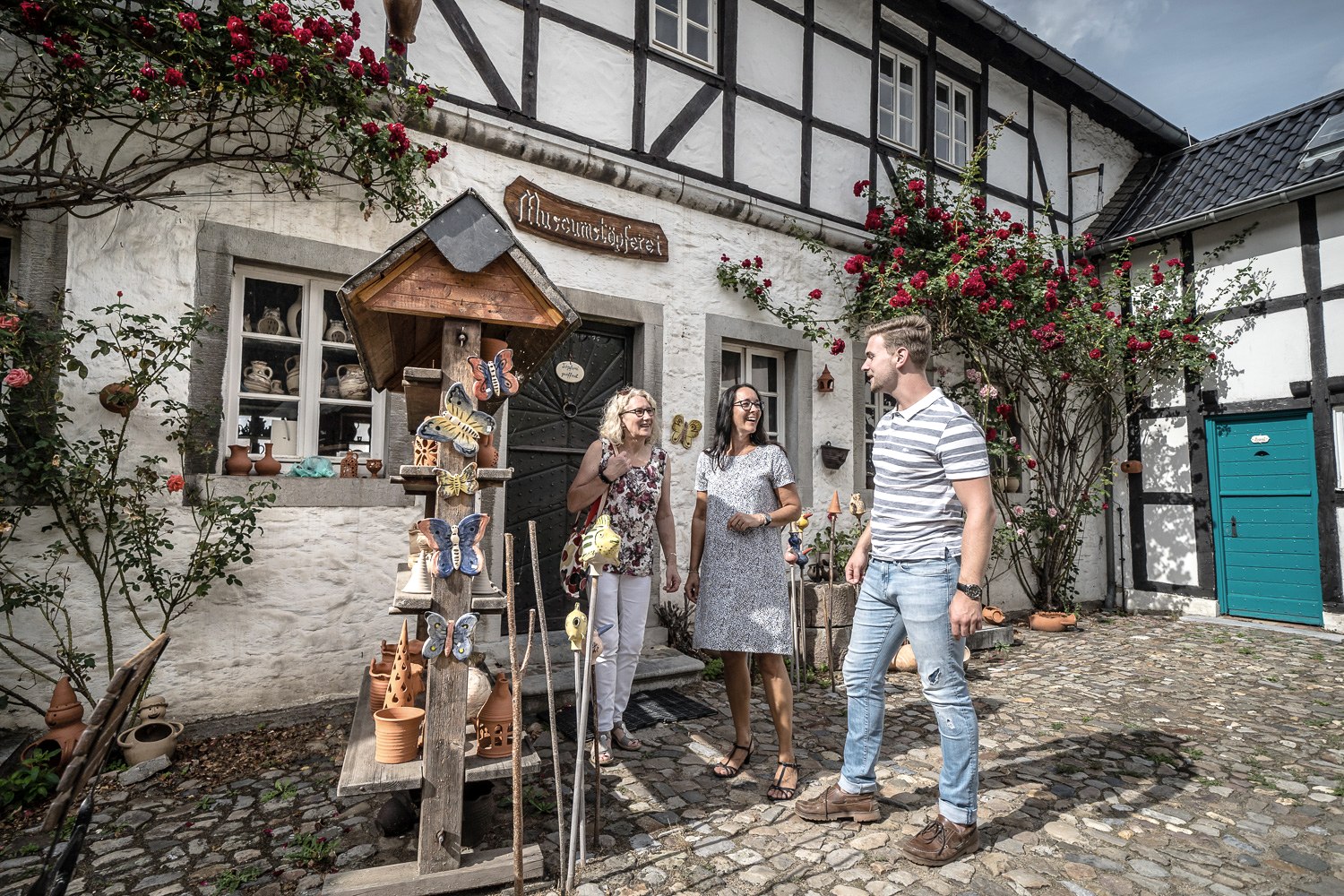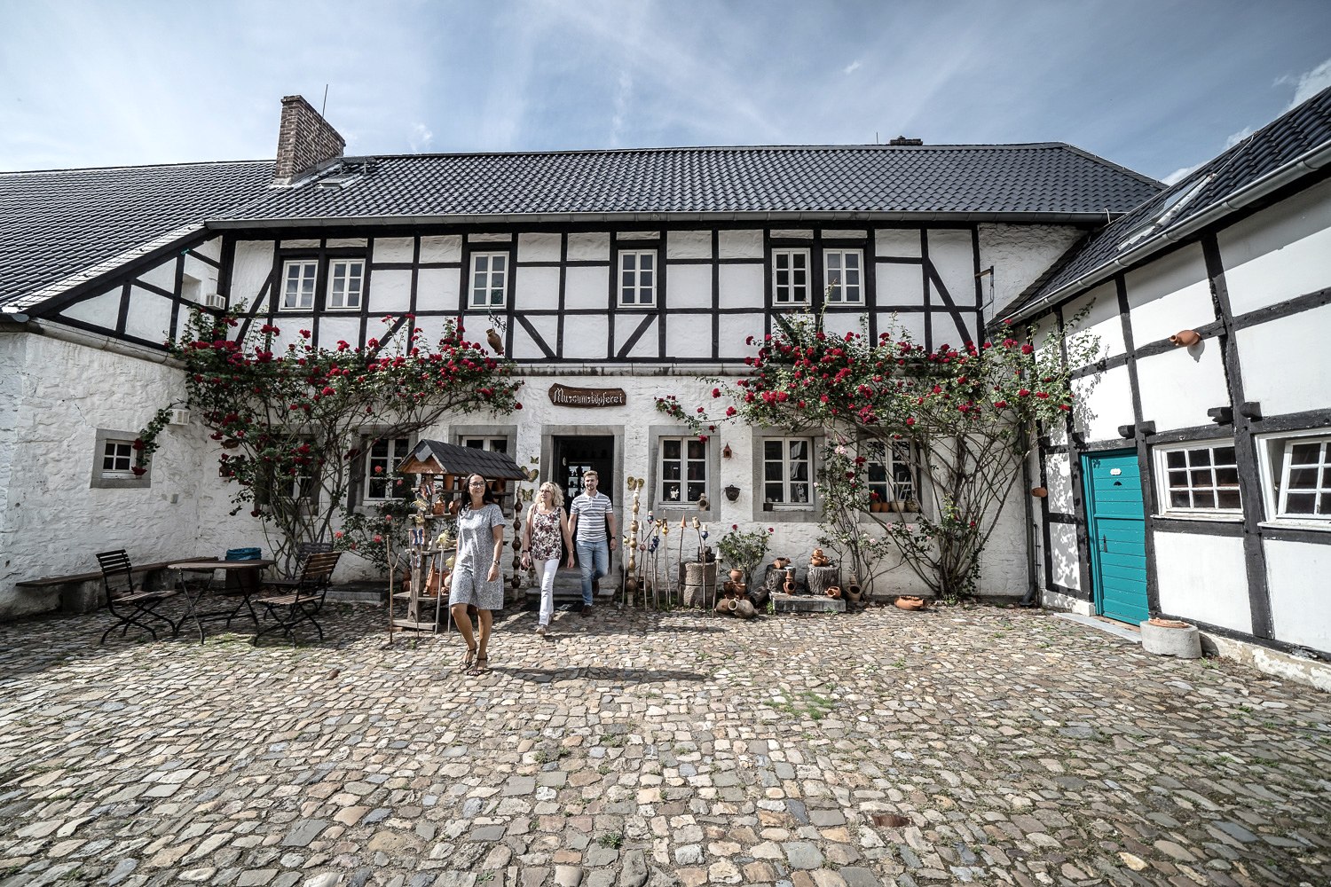 Die 17 Kilometer lange Schloss- & Höhenroute ist eine Kombination der indeland Radrouten 10 und 11. Sie verbindet spannende kulturelle und historische Orte und führt hoch und runter durchs indeland und rund um die Töpferstadt Langerwehe. Das Töpfereimuseum, erläutert anschaulich die seit über 1000 Jahre währende Geschichte der Langerweher Töpfer. Exponate, Modelle, Installationen und Filme lassen für den Besucher die Arbeitswelt der Töpfer lebendig werden. So erfährt man viel Interessantes über den gefährlichen Tonabbau in unterirdischen Schachtanlagen, das Verfahren des Steinzeugbrands oder die „Baaren“, große Vorratsgefäße. Weiter führt die Route vorbei am Kloster Wenau und unterhalb der stattlichen Laufenburg. Sportliche Radfahrer können hier einen Abstecher zur Laufenburg machen, die auf einer vom Sührbach umflossenen Anhöhe zwischen Heistern und Merode, südlich von Jüngersdorf liegt. Die Herzöge von Limburg errichteten die Laufenburg im 12. Jahrhundert, um die Grenze zum Einflussgebiet der Kölner Erzbischöfe zu sichern. Eine gute Möglichkeit für Radler im Café der Laufenburg eine kleine Pause einzulegen, bevor es dann weiter geht auf die Route 10 zur alten Kirche auf dem Rymelsberg in Langerwehe, die im 15. Jahrhundert als dreischiffige Hallenkirche im gotischen Stil erbaut wurde. Weiter führt die abwechslungsreiche Route vorbei an der römisch-katholischen Nikolauskapelle, einem der ältesten historischen und kirchlichen Baudenkmäler des Kreises Düren aus dem 11./12. Jahrhundert. Als ein ganz besonderes Highlight führt sie ausdauernde Wanderer oder Radler bis zum Schloss Merode, welches zu den beeindruckendsten Herrschaftssitzen in der Region zählt. Auf Schloss Merode finden zahlreiche einzigartige musikalische und kulturelle Veranstaltungen statt, die sich mit einem Spaziergang oder einer Fahrradtour bestens kombinieren lassen.
