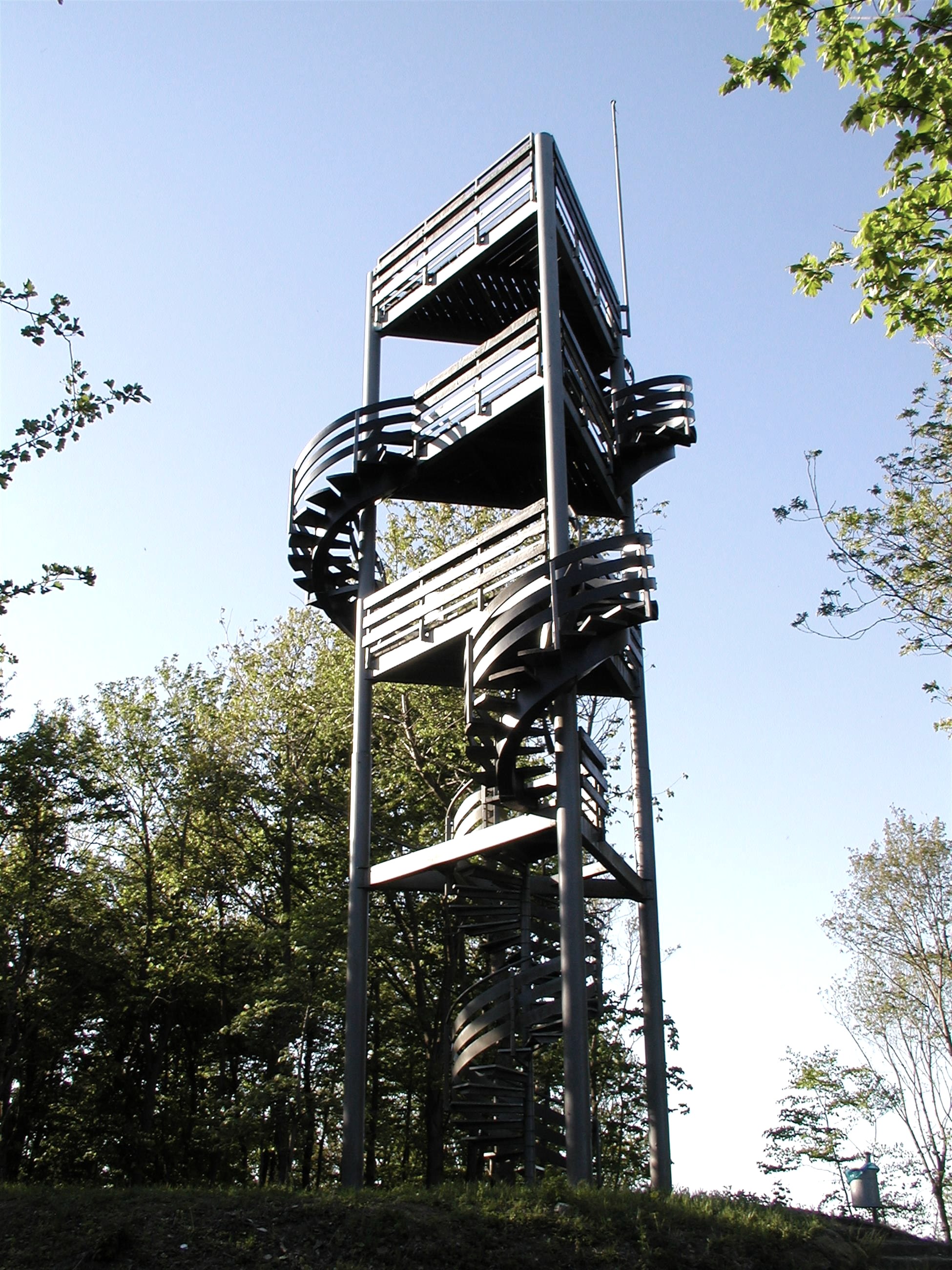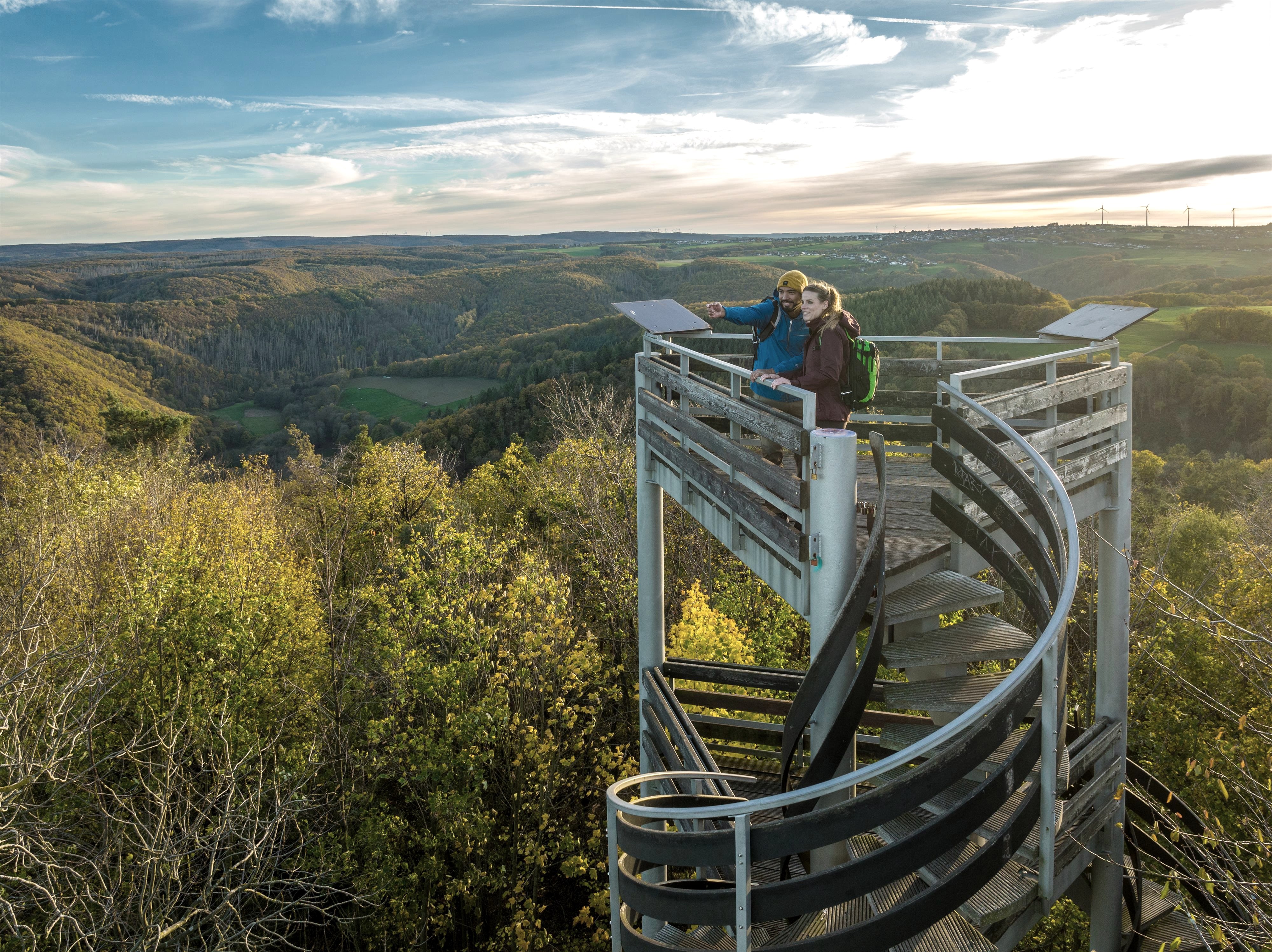 Vom "Krawutschketurm", nach dem Eifelwanderer Franz Krawutschke benannt, bietet sich ein atemberaubender Blick über die Höhenzüge der Eifel. Vom Parkplatzrand schweift der Blick über das sich weitende Tal der Rur mit dem Staubecken Obermaubach über den Rand der Eifel hinaus in die Jülicher Börde und die Kölner Bucht.