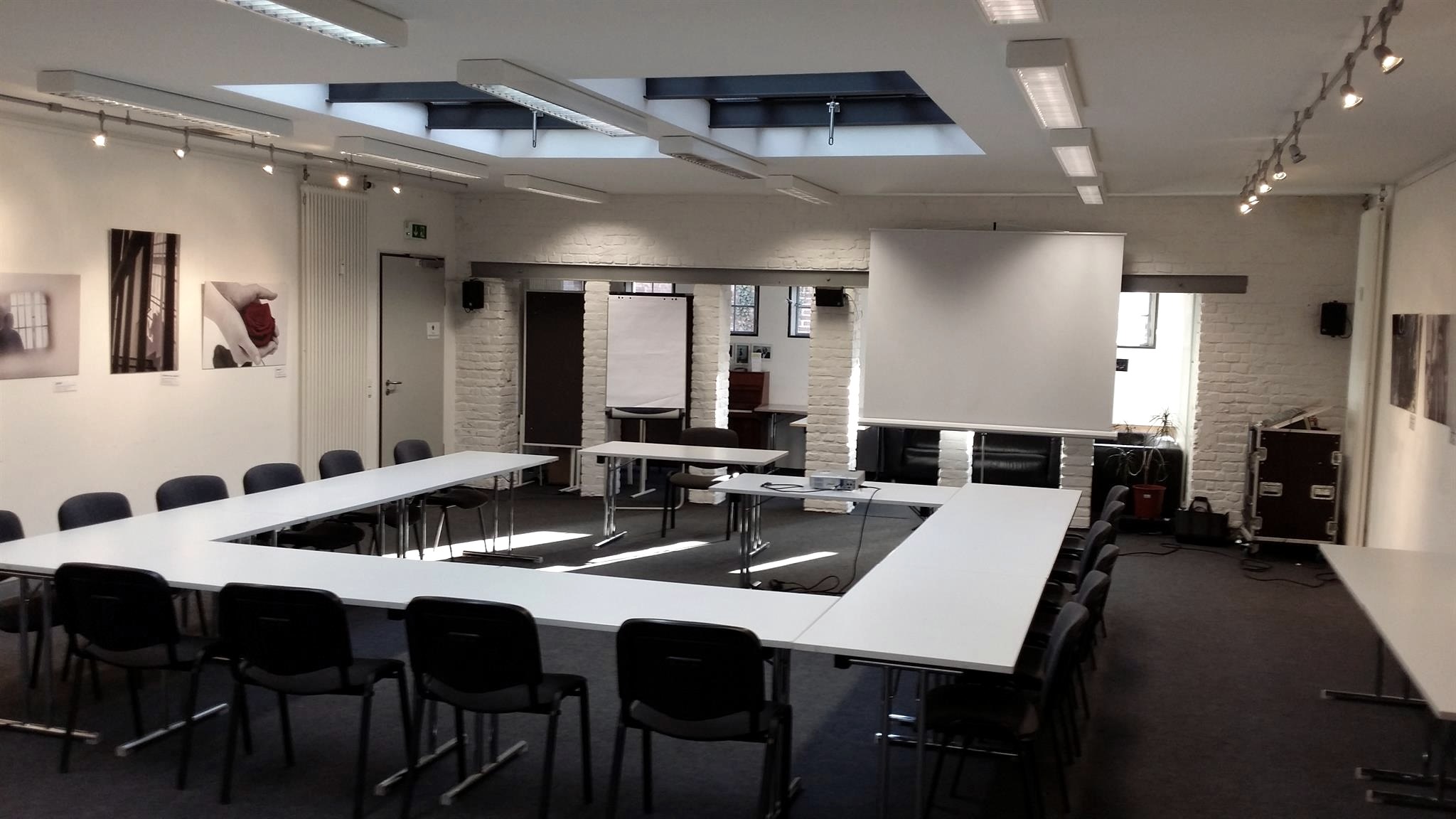 Technik: Inklusive Beamer, Leinwand, Flip-Chart/Magnetboard, Pinn-Wände, Notebook-/Smartphone-Anschluß an Tonanlage.