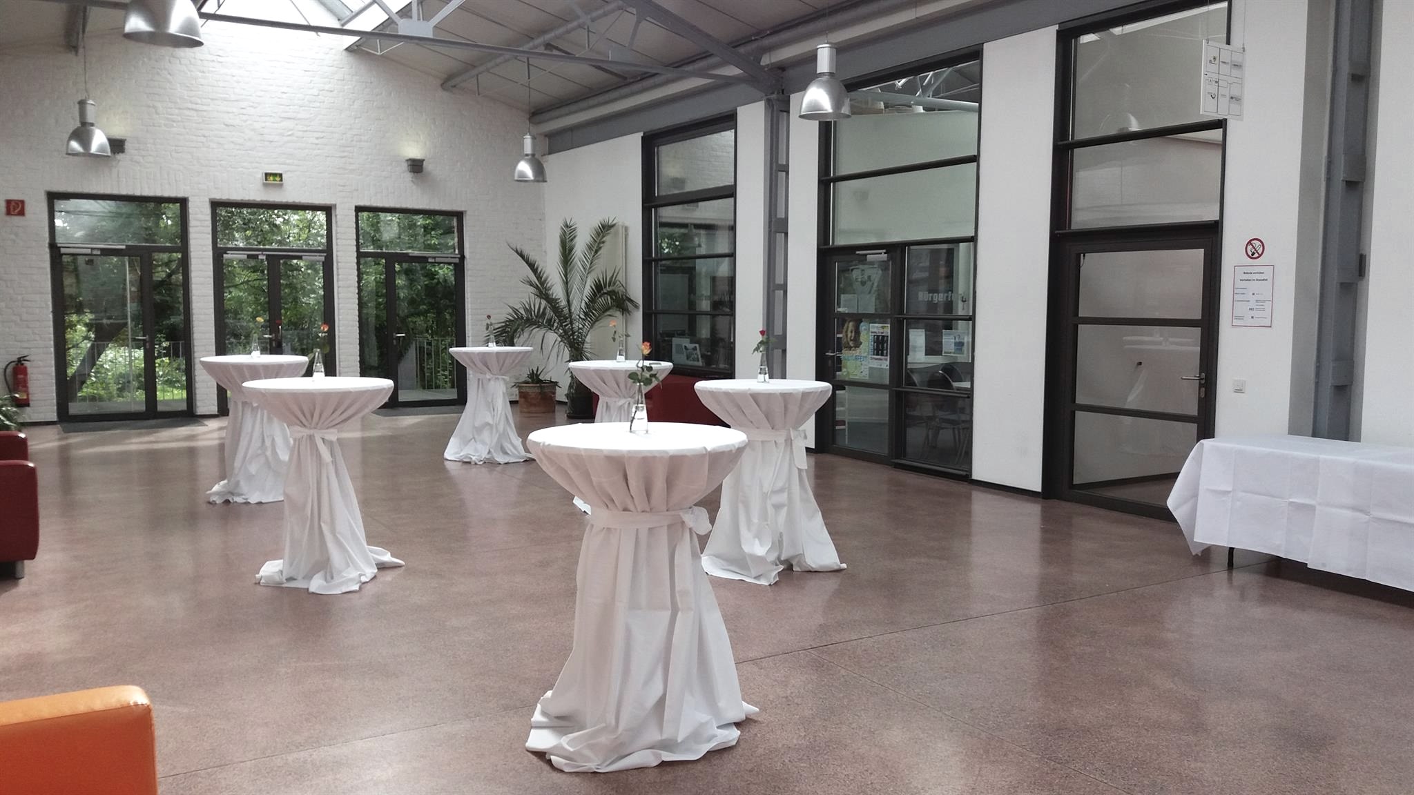 Weitere Ausstattung: Stehtische mit Hussen, Buffettische, Palmen, Pflanzen; Großkühlschränke, Theke