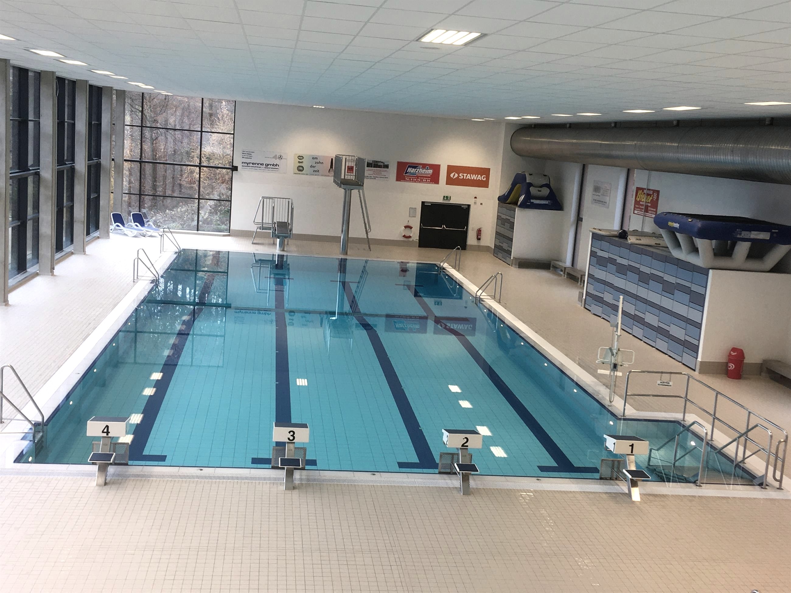 Bei 28,5 Grad Wassertemperatur bietet das 25 Meter-Becken mit Sprungbrett und Drei-Meter-Turm 4 Bahnen. Lehrschwimmbecken und Kinderbecken sind auch vorhanden.