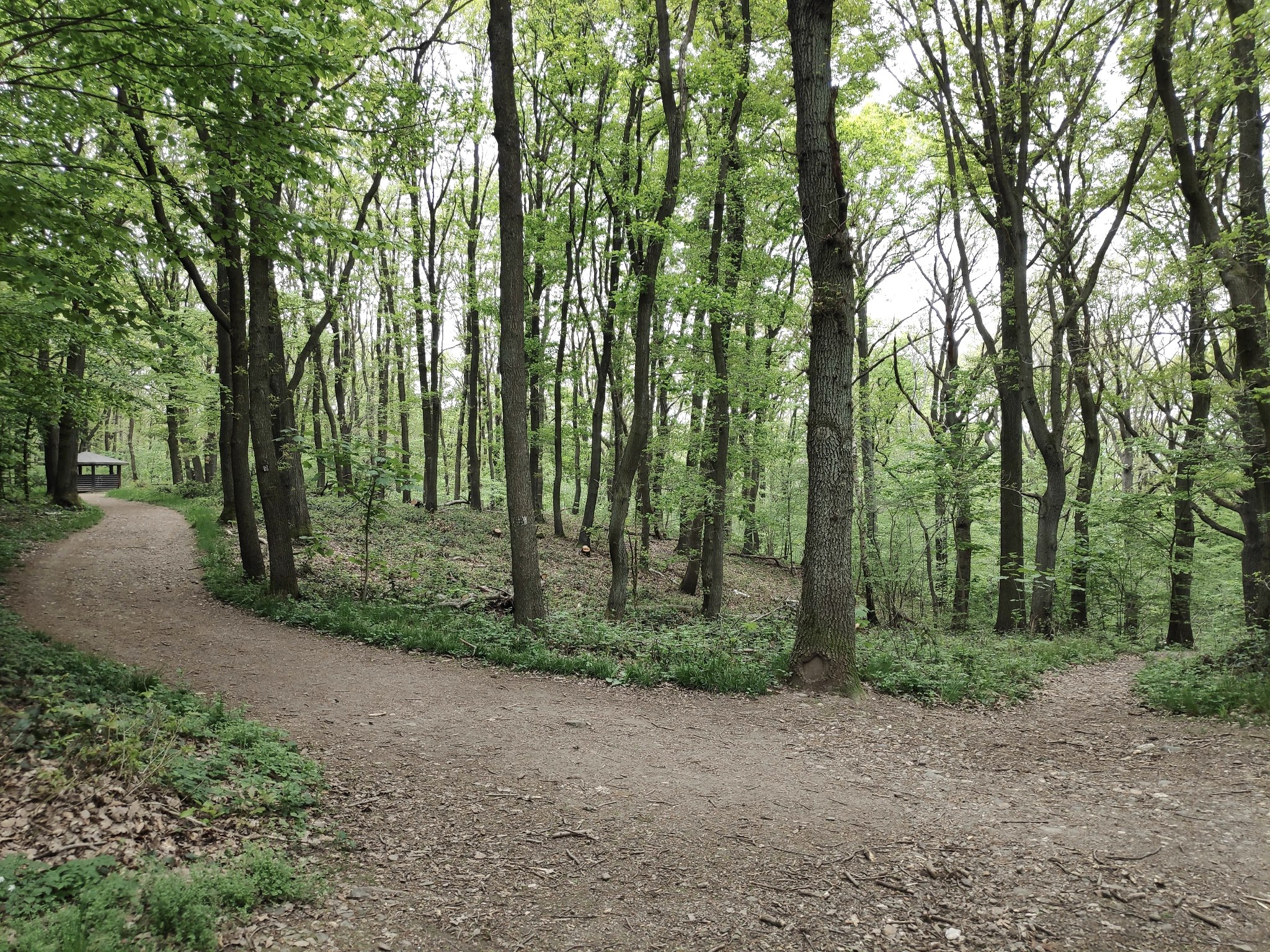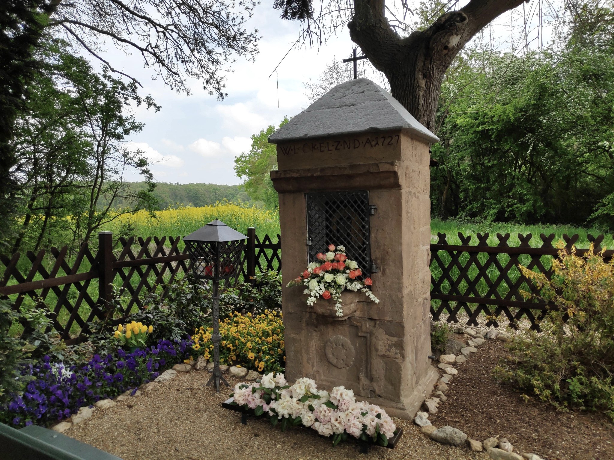 At the next fork in the path, we keep left, turn left again at the end of the path and right at the next opportunity. We now walk downhill on this path until we reach the Wasserburgen-Route cycle path again at a bench, where we turn left. We continue straight on until we reach the Mother of God's hut, where we first turn right and then left again.