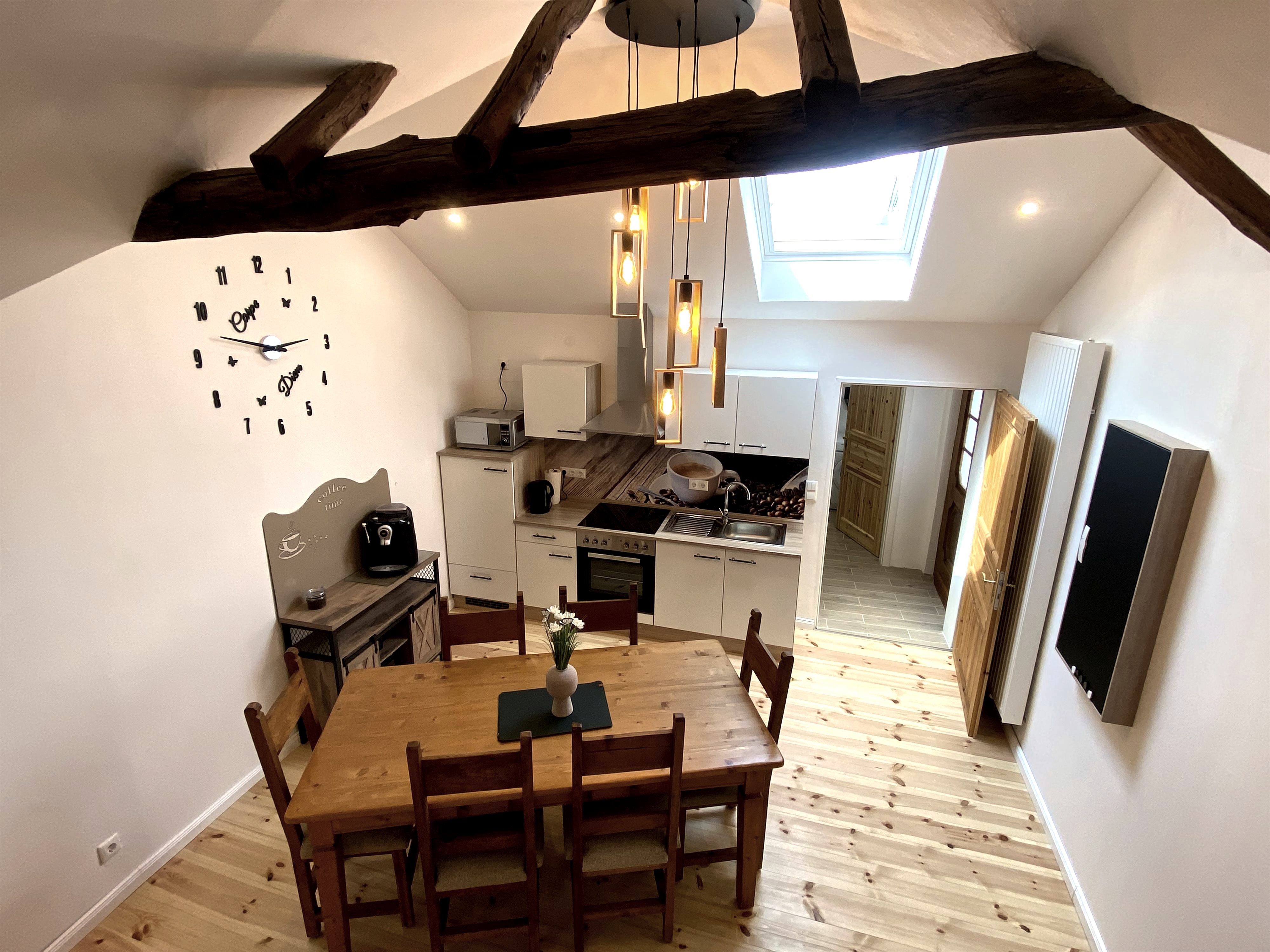 Lovingly renovated vacation apartment in a historic half-timbered house. Here history meets modernity. You can expect a large shower, double bedroom, sleeping balcony, living area with sofa bed and kitchenette plus sideboard with fully automatic coffee machine