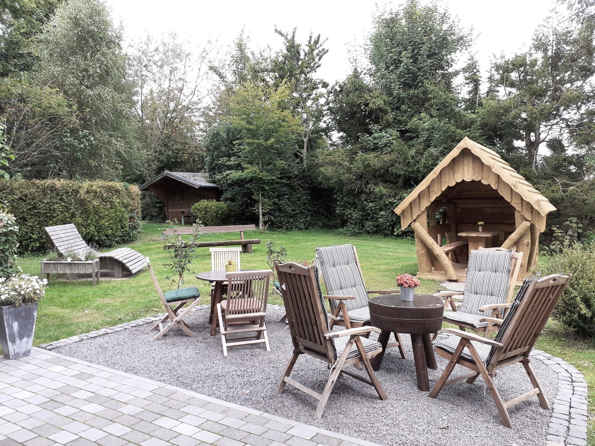 While the “little ones” let off steam on our playground, with trampoline and football goal, the “big ones” rest within sight on our comfortable seats or loungers.