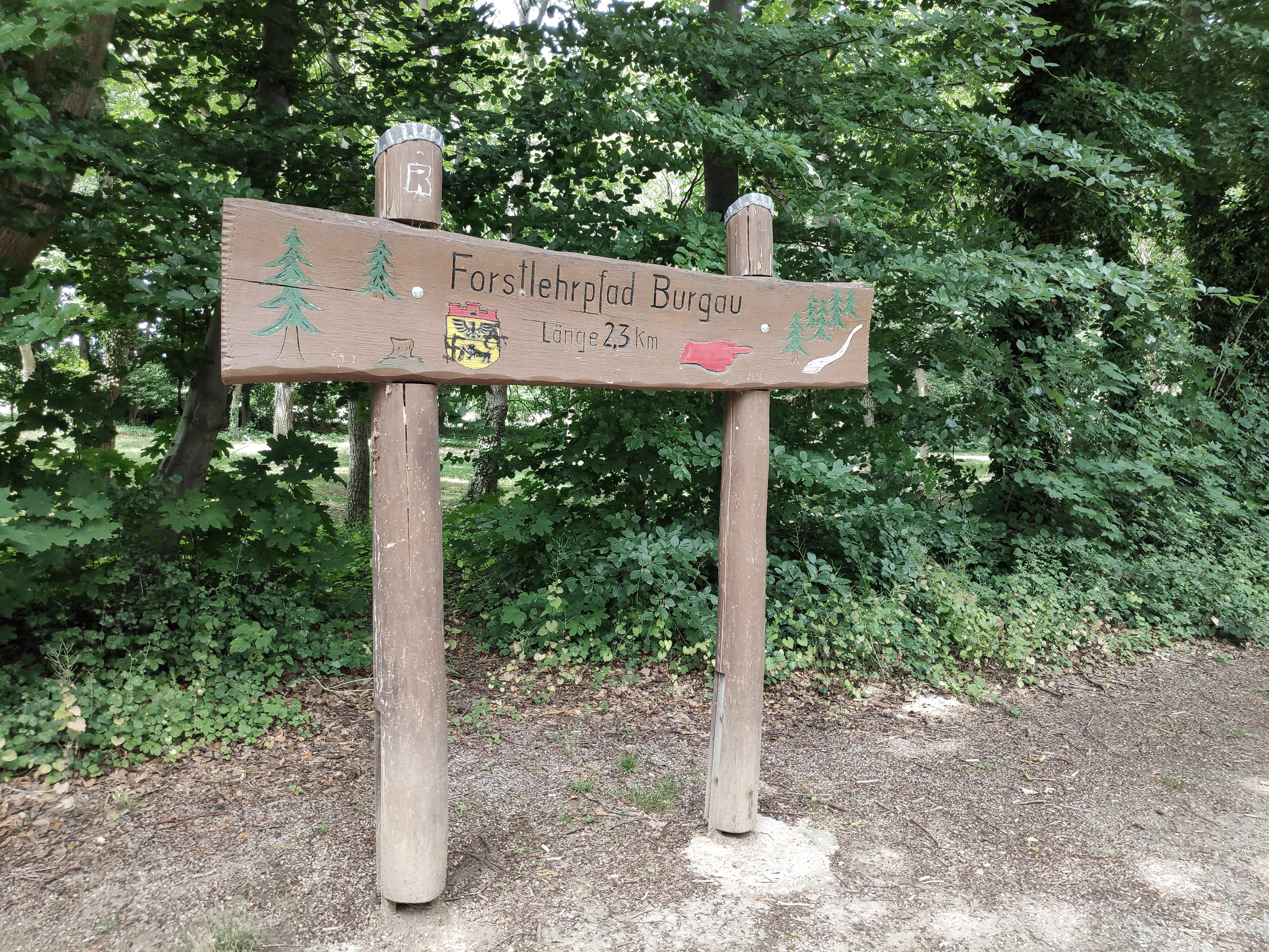 At the entrance to Burgau Castle, keep left, pass the signpost about the "Gemeine Fichte" and turn left at the first opportunity (towards the Bleckmann 01 circular trail). At the next junction, keep right and at the large crossroads with the two benches, go straight on to the end of the path and turn right. At the next crossroads, we turn left and are now back on the Bleckmann 01 circular trail. At the refuge, we keep straight on and continue along circular trail 01 (also a trail for the blind). At the T-junction, turn right and follow the path, which bends to the left, to the end. Here we turn right and follow circular trail 01 along the paved path past Weyern Estate. We continue along the now unpaved path until we reach a crossroads with a large stone. Here we turn right and follow the cycle path and hiking trail 01 along the moat of Gut Weyern. After around 400 m (from the entrance to Gut Weyern), the main path branches off to the right and leads back to Burgau Castle (shortcut option and barrier-free variant). However, we continue straight ahead on the now ascending path and at the top turn slightly right off the tarred path onto the unpaved path, which continues to ascend (be careful not to turn off onto the forest nature trail). At the end of the ascent, we turn right and continue along hiking trail 01. We now leave the forest and walk a sunny section of our hiking tour in fine weather. We leave the wide path at a tree stump and turn right onto a path (hiking trail 01). Where the path meets a wide path again (red barrier), we turn right and walk straight ahead until we reach a crossroads where there is a tree with a split trunk, one of which is just a stump. There is also a bench here. At this point we turn right and then left at the next crossroads towards the refuge. We walk past the hut and follow hiking trail 01 straight ahead until it joins a downhill path on the right. We follow this downhill and now reach a parking lot for hikers. We keep to the right and follow the tarred path and hiking trail 01 towards the animal shelter. We leave this on the left and continue straight ahead. At the junction with the forestry nature trail (insect hotel station), we turn left towards Burgau Castle and walk along the moat back to the starting point.