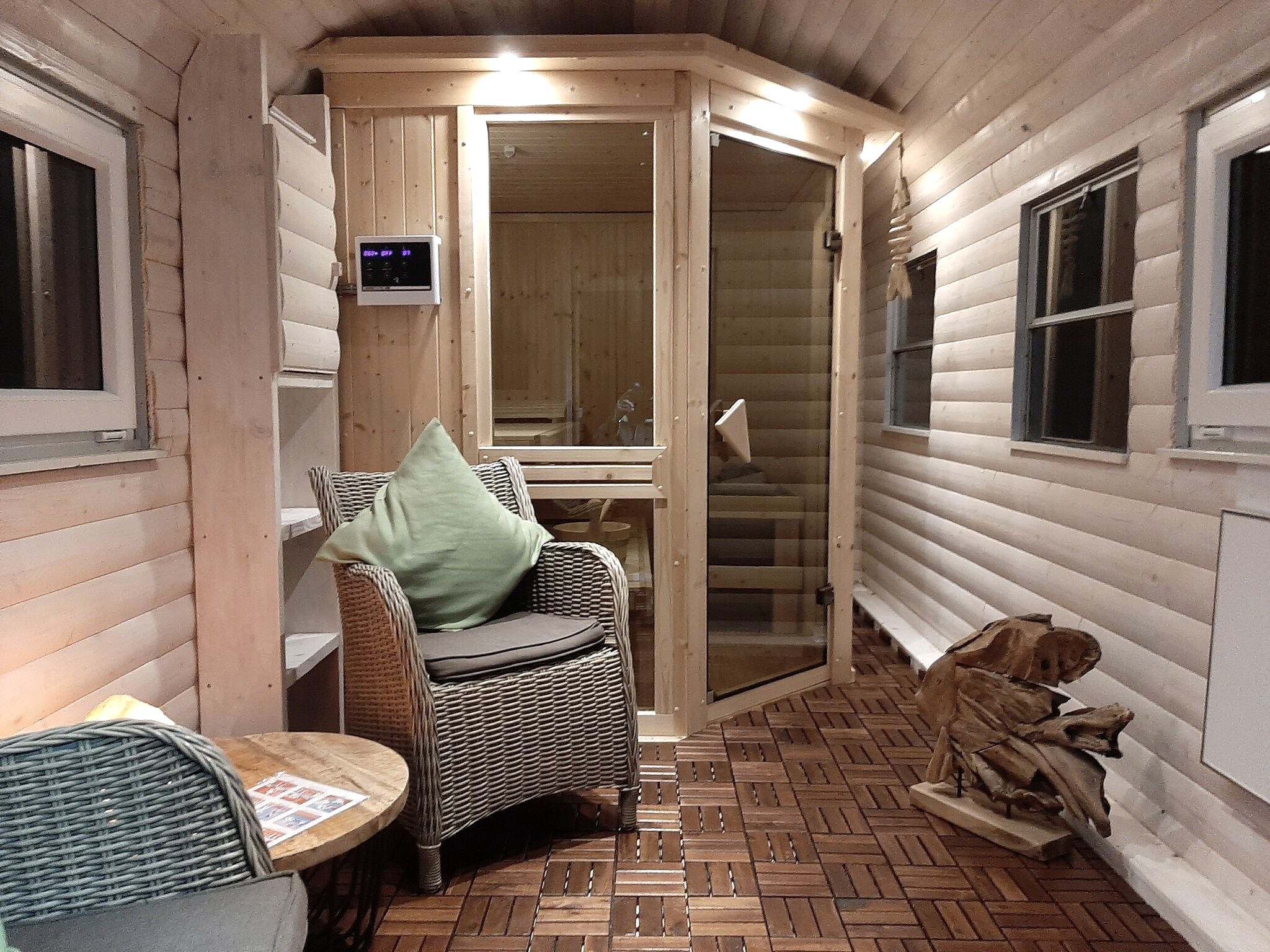 Our exclusive solid wood log house, newly built in 2022, with a view of the Eifel National Park in a dreamlike, isolated location, makes wishes come true. Exclusive living (for adults only) in our individually realised solid wood log house on a spacious, sun-drenched plot with a fantastic view of the Eifel National Park. The fascinating open-plan construction inspires and floor-to-ceiling panoramic windows lead onto a sunny terrace of approx. 90 m², which is partially covered. In the comfortable living room, a high-quality designer kitchen convinces with many positive amenities. A leather sofa to relax and enjoy the ambience fits stylishly into the overall picture. Smart TV / 43 inch, internet radio and free W-Lan in the entire house are a matter of course. Underfloor heating provides comfort and well-being and delights with pleasant warmth. Those who like it cosier can heat the stove in the living room, which fits perfectly into the picture. Natural materials ensure a healthy and natural feel-good climate in our non-smoking log cabin, which allergy sufferers will also appreciate. Pets are therefore not allowed. The large bathroom with walk-in shower, toilet, urinal and modern washbasin turns out to be a jewel due to its open roof truss with integrated glass windows. The additional guest toilet rounds off the comfort. Two separate, high-quality bedrooms with box spring beds, allergy-suffering bed linen, Smart TV / 43 inch, offer access to the terrace. At this place of longing, the sun, the moon and the stars will be in competition with you. Enjoy an exclusive sauna session in a unique ambience at dusk. Our lovingly prepared sauna trolley, also known as the "sweatbox", will whisk you away to a dreamlike setting between heaven and earth.