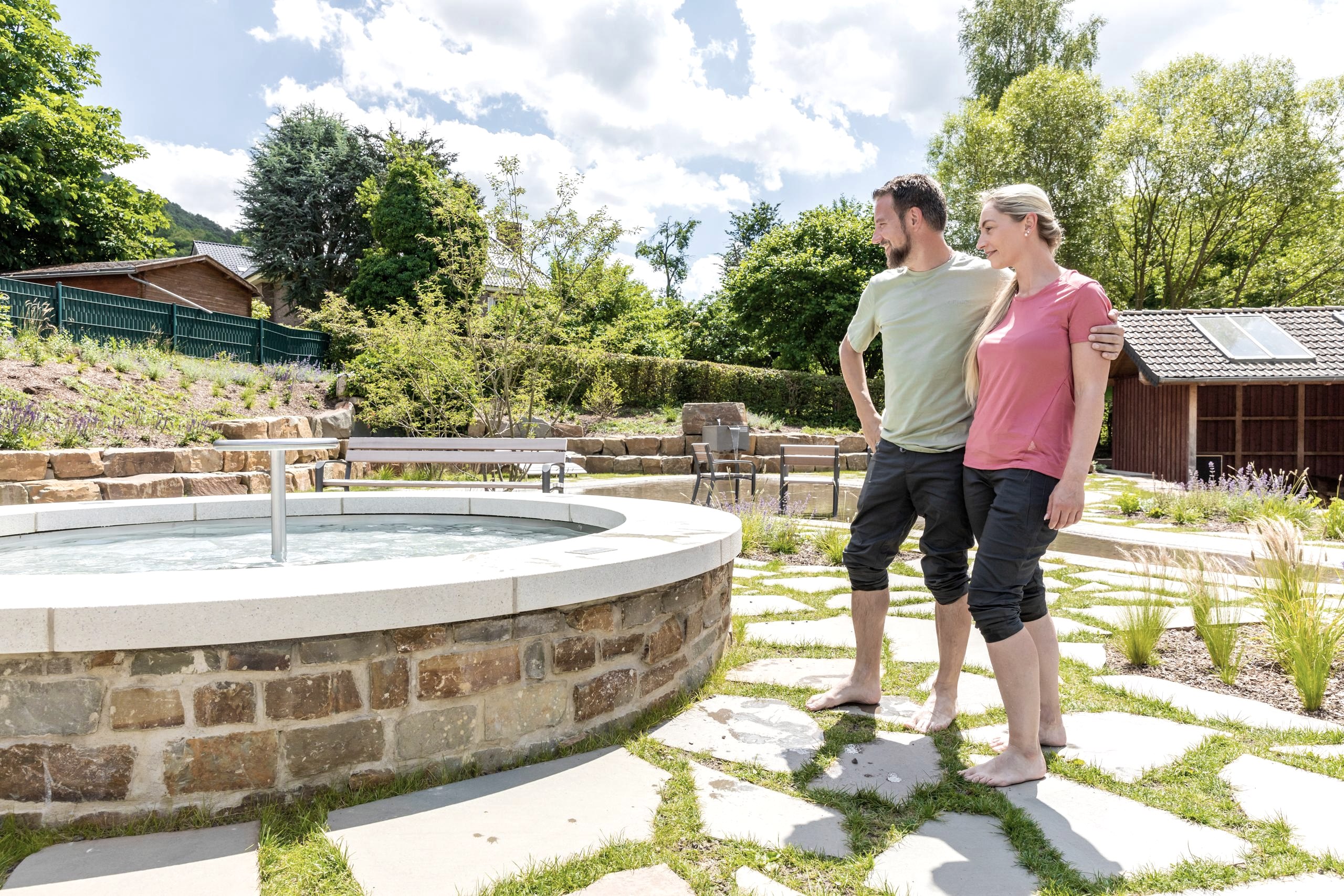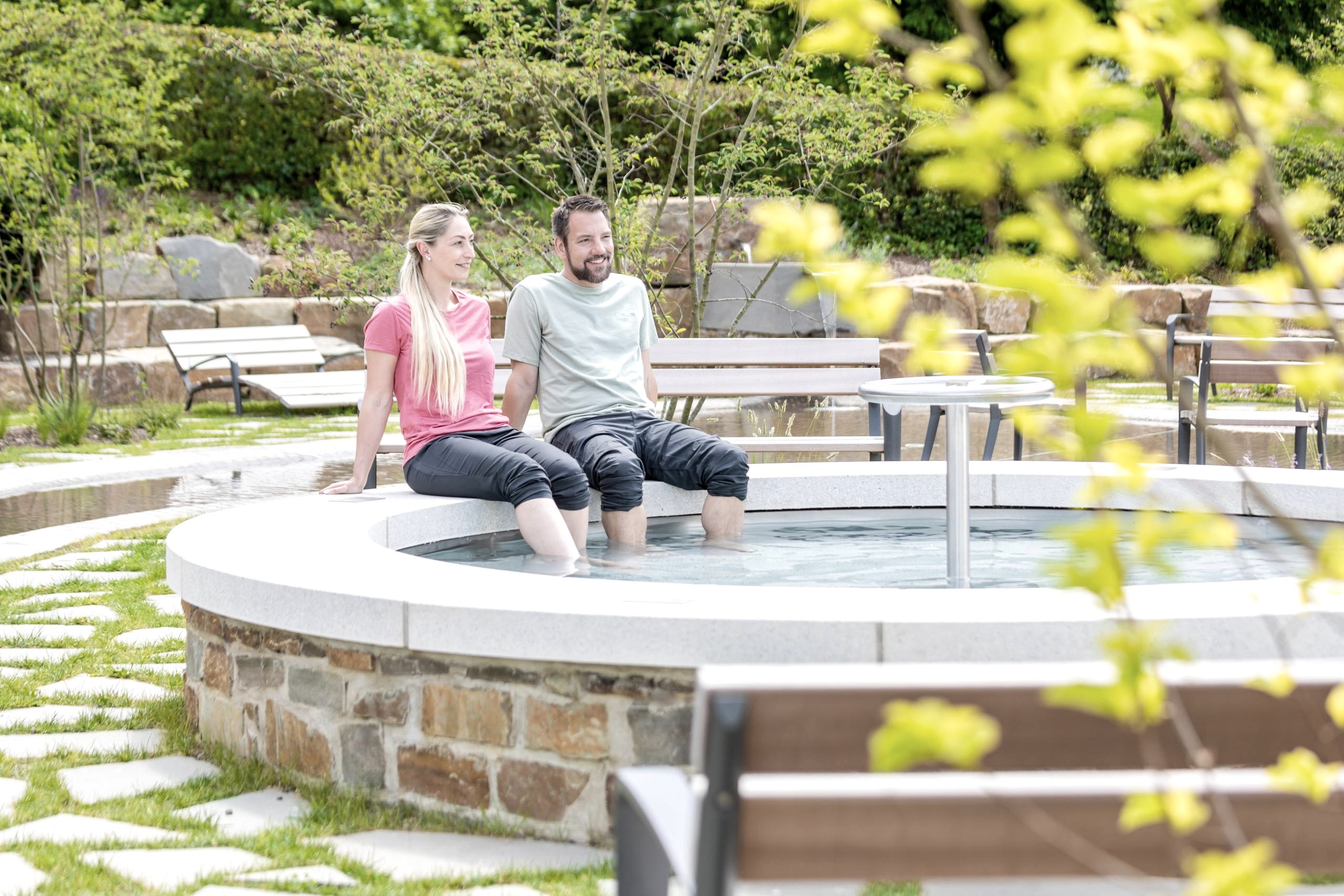 Various water-related elements invite you to refresh, relax and unwind after a long bike ride or hike or simply on a hot day. At the generous area of Water with seating and a smaller pool with a seat edge, you can refresh your tired feet and an extra stone pool allows you to cool your arms extensively and relaxed.
