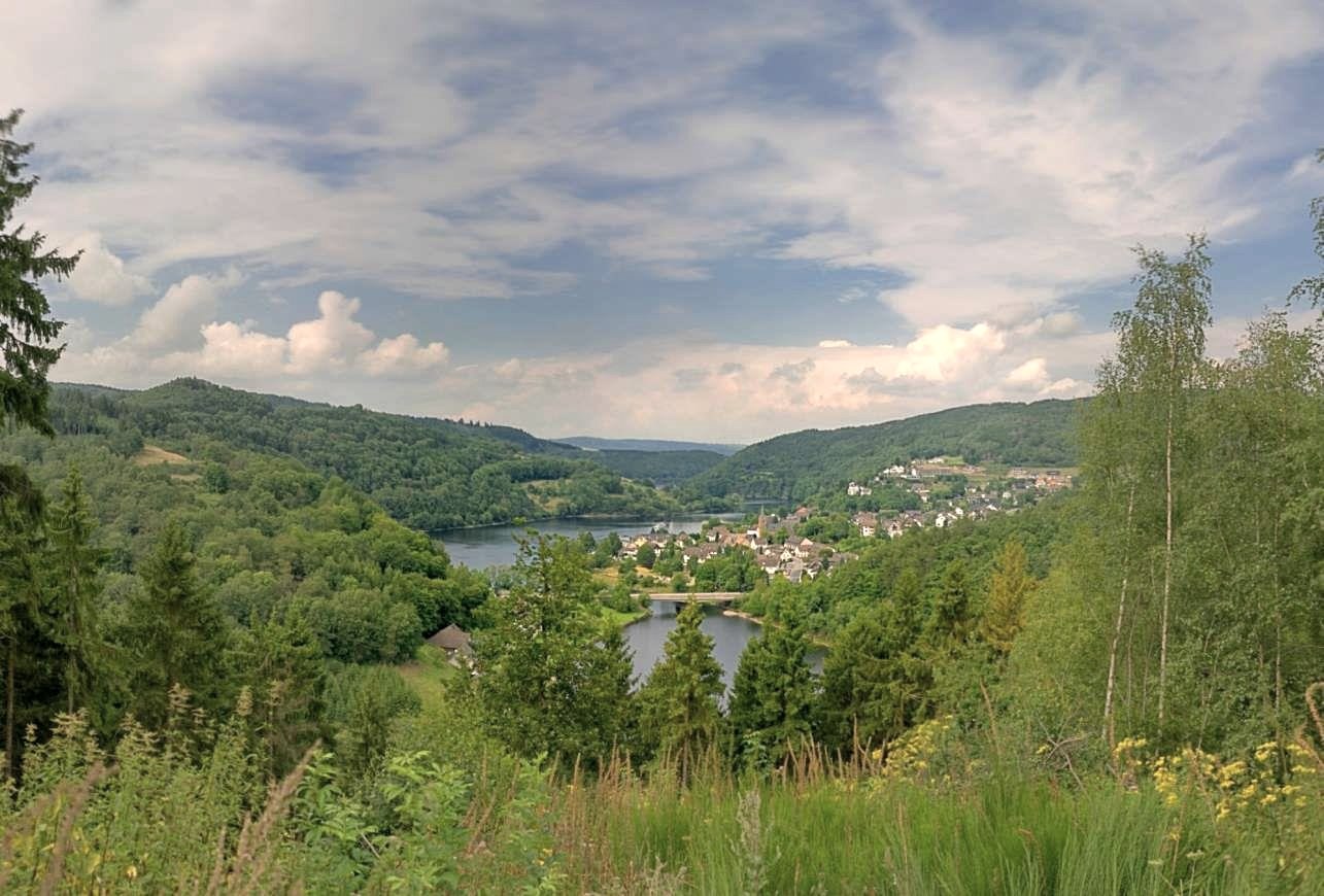 L'Eifel-Blick "Wolfshügel" se trouve à 360 m d'altitude, au-dessus d'Einruhr. Cette situation exposée permet d'avoir une vue fantastique sur ce petit village de l'Eifel qui vaut la peine d'être vu. Au-delà du village, la vue s'étend sur le lac supérieur jusqu'à la zone forestière de Buhlert. Le pont sur la Rur visible au premier plan a été construit au 19e siècle et fut le premier pont en pierre à traverser la Rur.