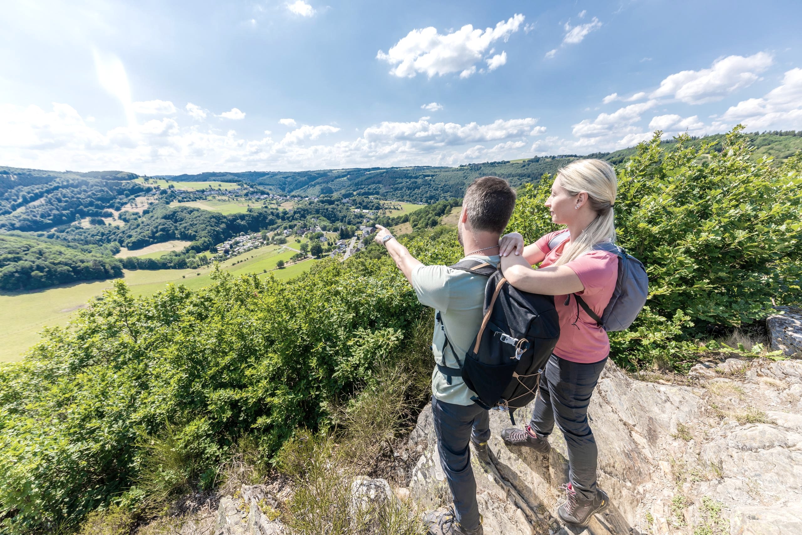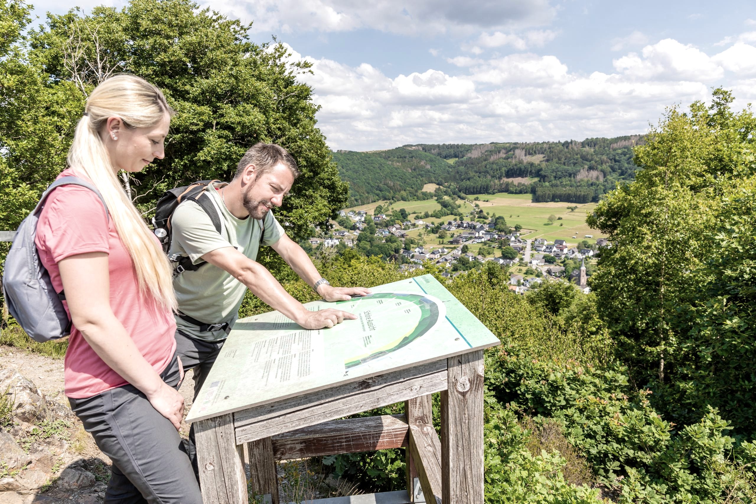 Het prachtige uitzicht reikt tot in het dal van de Rur, kort voordat deze uitmondt in de Obersee. Aan de andere kant van het dal ziet u de bossen en open terreinen van het voormalige militaire oefenterrein Vogelsang, dat nu deel uitmaakt van het Nationaal Park Eifel.