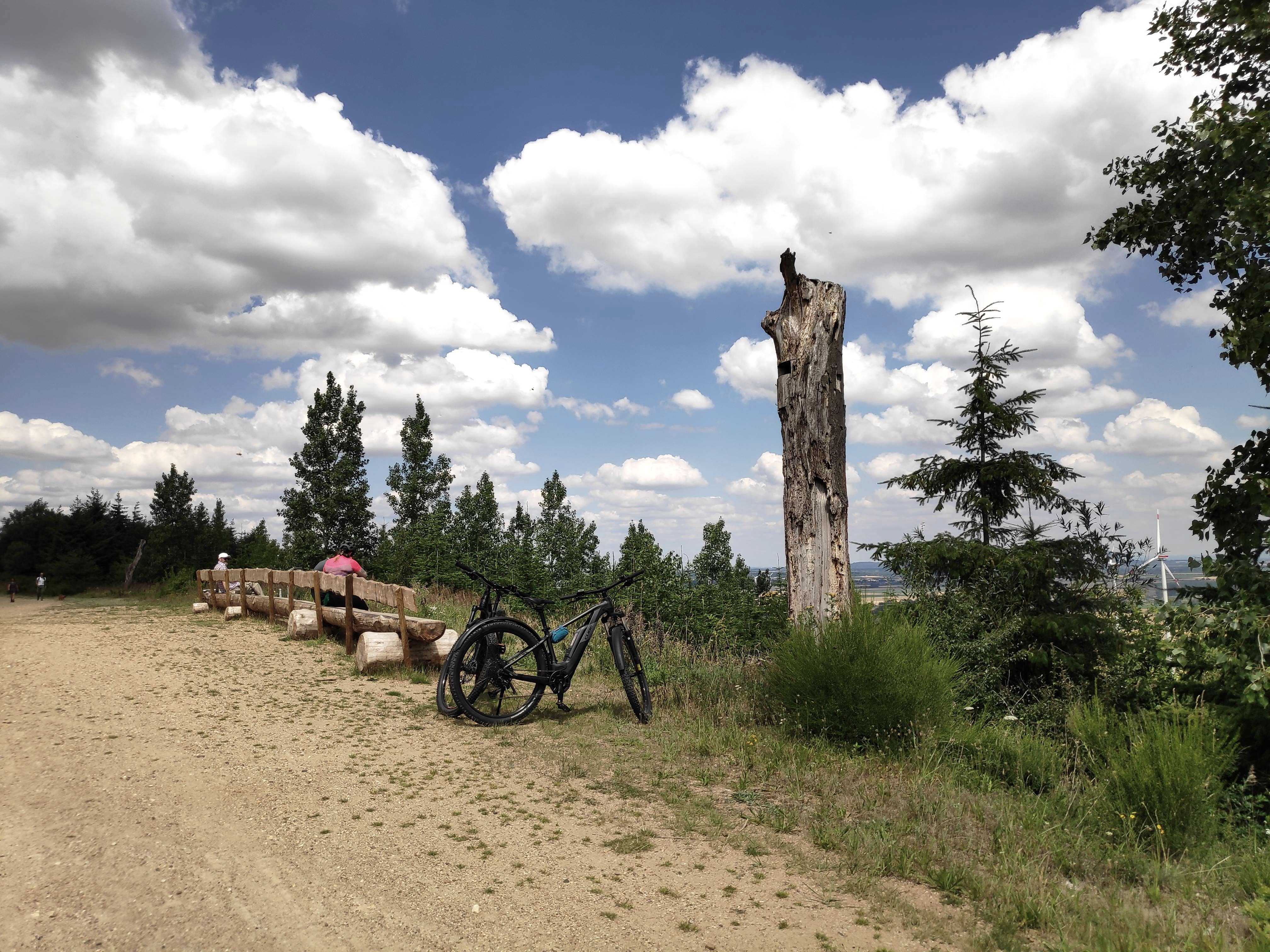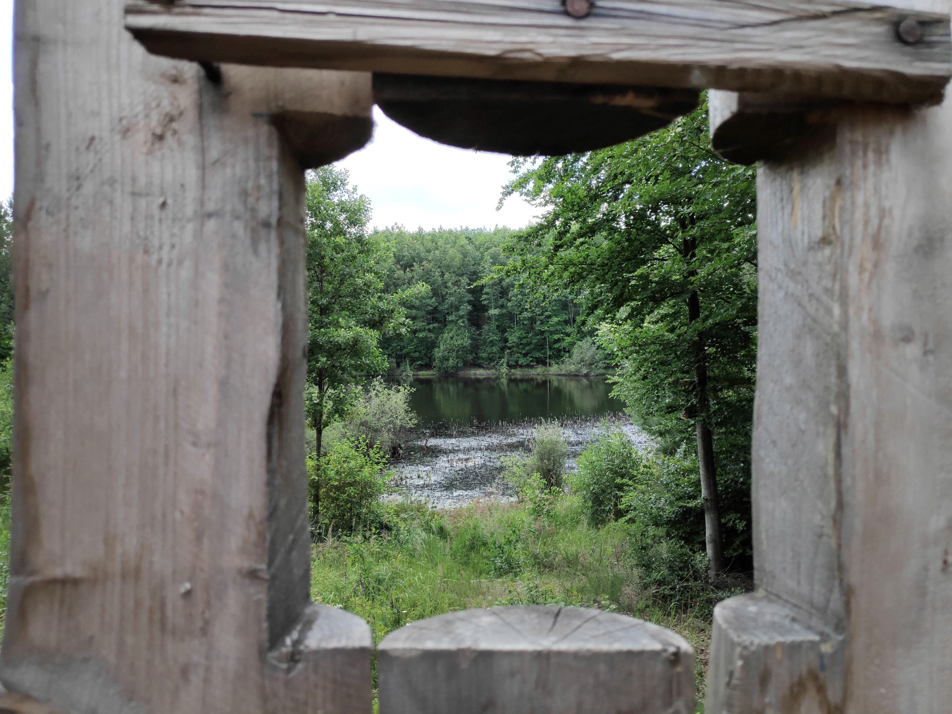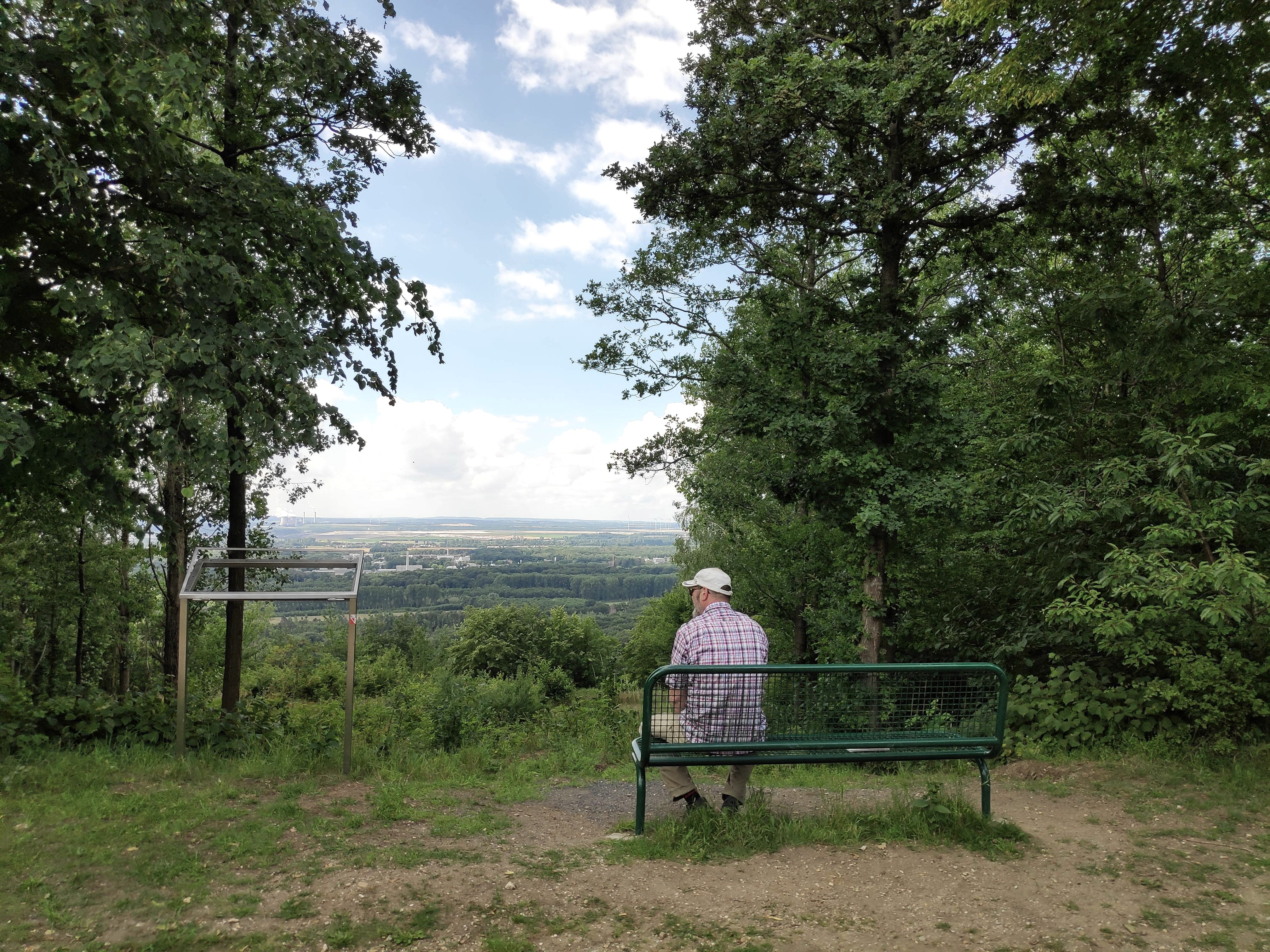 We verlaten de Höller Horn langs dezelfde weg als we gekomen zijn en keren terug naar reddingspunt 39. Hier slaan we rechtsaf en volgen de "Krummer Weg" tot het einde bij reddingspunt 30. Hier slaan we rechtsaf en houden ook rechts aan bij de volgende splitsing. Kort voordat we de kruising bij reddingspunt 37 bereiken, kunnen we een glimp opvangen van een betoverd meer door een "kijkgaatje". Bij reddingspunt 37 gaan we rechtdoor. Aan het einde van het pad houden we links aan en bereiken we bij reddingspunt 58 een lange bank met een prachtig uitzicht in de richting van Elsdorf / Bergheim. We gaan verder over het bovenste pad, dat ons na een bocht naar rechts gestaag bergopwaarts brengt naar reddingspunt 55. Hier slaan we linksaf en volgen het pad.