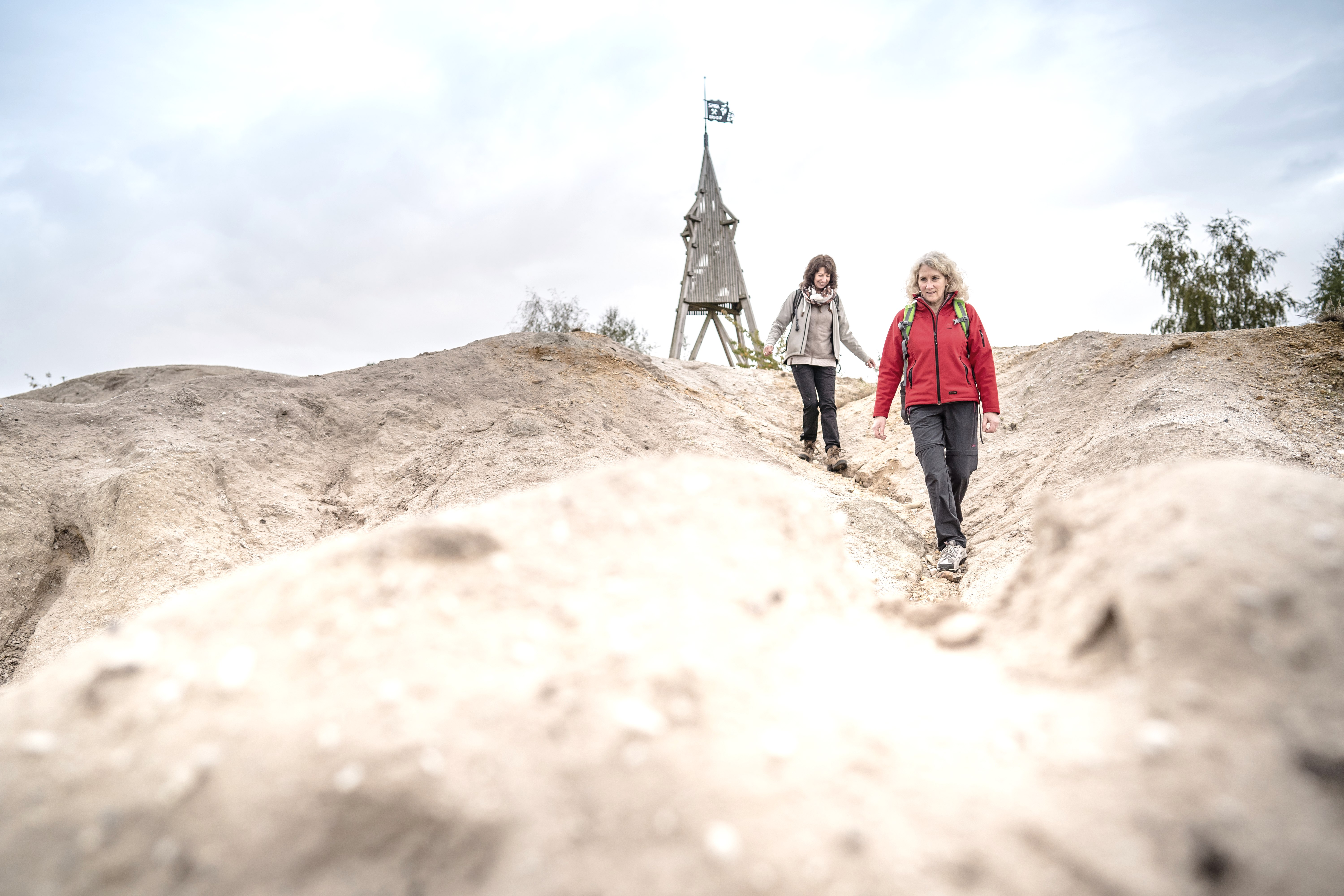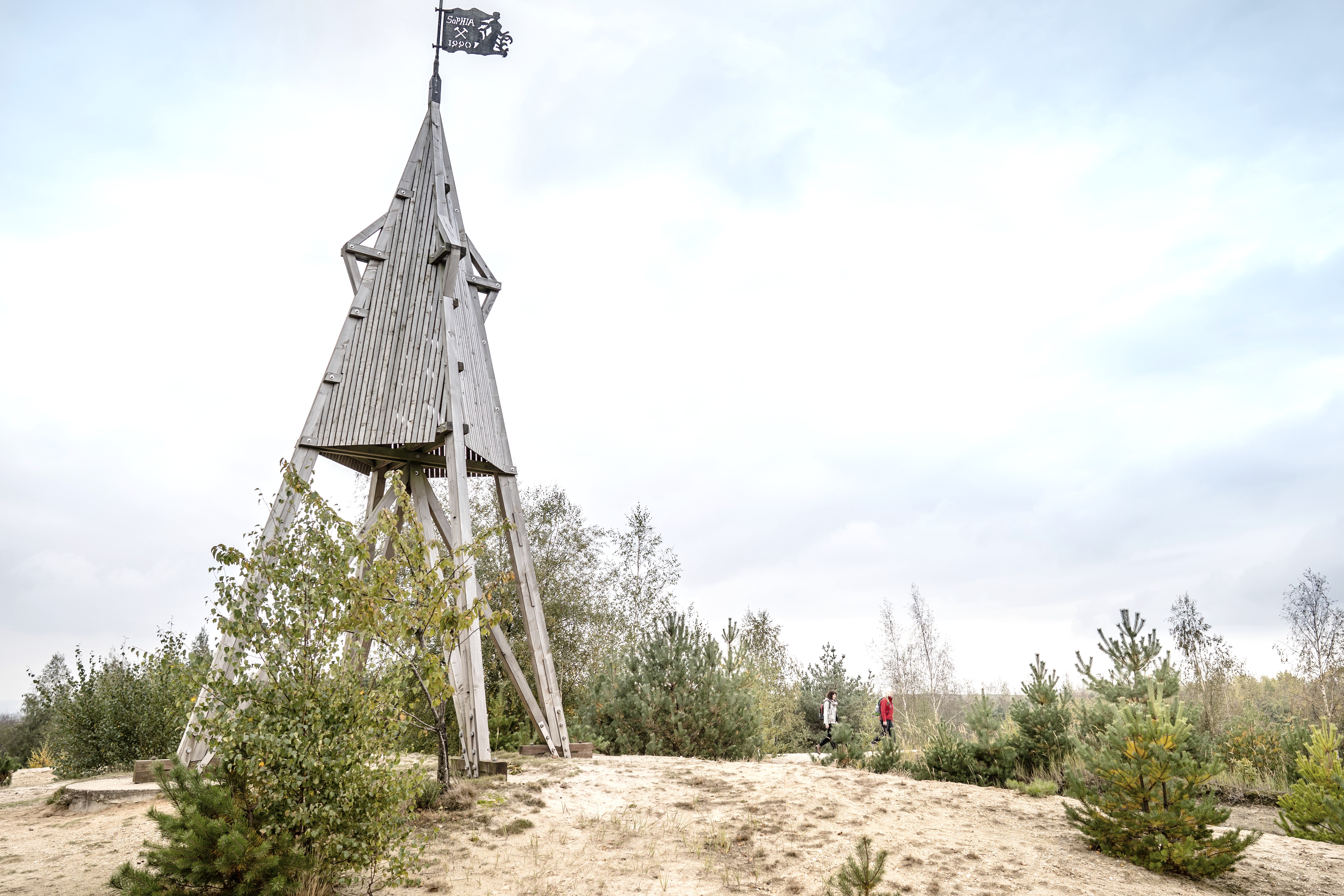 We verlaten de heuvel met de Romeinse toren via het pad bergafwaarts en gaan aan het einde rechtsaf het brede pad op en houden bij de T-splitsing weer rechts aan. Bij reddingspunt 39 maken we een omweg naar de Höller Horn, d.w.z. we gaan rechtsaf (wegwijzers F en D) en na een paar stappen gaan we linksaf een zandpad op dat ons naar een zandheuvel met pionierplanten (Höller Horn) brengt.Deze heuvel werd niet opnieuw gecultiveerd om de natuurlijke verspreiding van fauna en flora te bestuderen; in plaats daarvan werd er alleen voedselarm zand, kleiachtig materiaal en grind gestort. De toren, die wordt gesierd door een windwijzer met de woorden "Monte Sophia" (zoals de Sophienhöhe bekend staat), is gemodelleerd naar een ertsmijn-windtoren uit de late middeleeuwen.