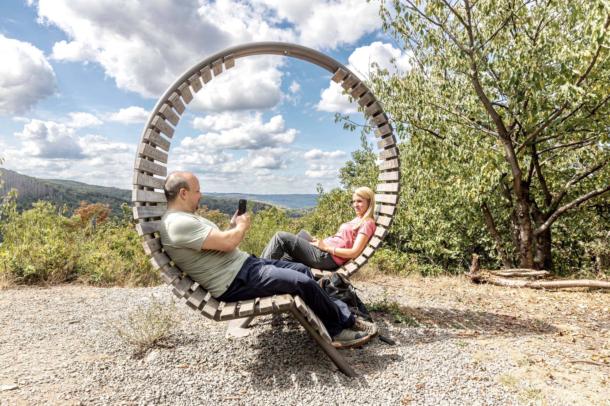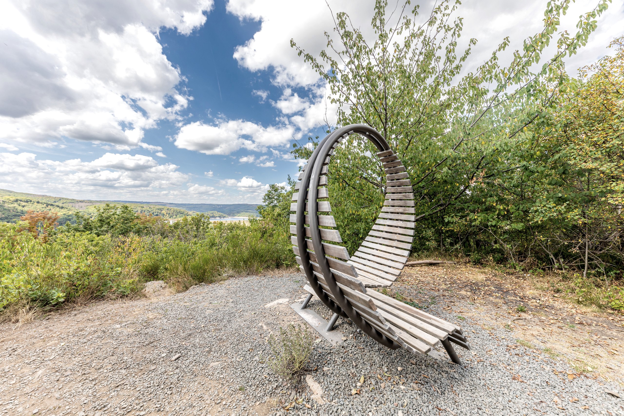 Auf dem Meuchelberg angekommen, wartet schon der sogenannte Eifel-Loop auf dich. Die außergewöhnliche gebogene Sitzbank bietet Platz für zwei gegenübersitzende Personen. Sie spiegelt so die Kommunikation auf einer Wanderung wider. Lehne dich also mit deiner Begleitung zurück und tauscht euch über die malerischen Panoramablicke aus. Am Südhang könnt ihr außerdem zahlreiche strauchartige Eichen erkennen. Dieses ungewöhnliche Bild zeigt die Überreste der ehemaligen Niederwaldwirtschaft. Hier wurden Bäume aufgrund des hohen Brennholzbedarfs für Kohlenmeiler bis kurz über dem Erdboden abgeschlagen.