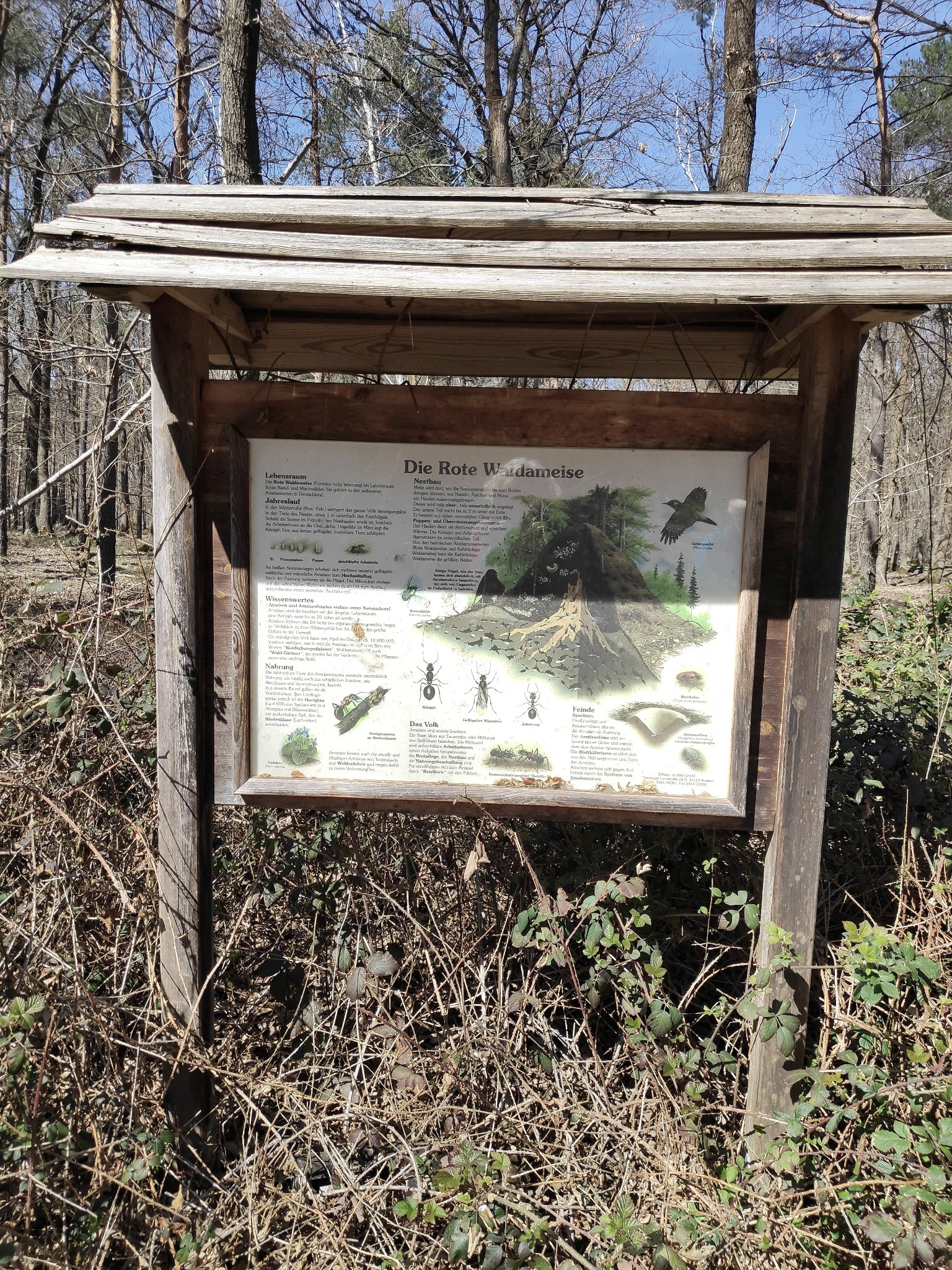 An der Infotafel über die Rote Waldameise trennt sich der große Heideweg (dunkelblaue Markierung) vom Rundweg Nr. 52. Wir folgen ab dieser Stelle der Eifelvereins-Markierung Nr. 52 geradeaus. Am Ende des Weges biegen wir an der T-Kreuzug mit Ruhebank rechts ab und treffen hier wieder auf die dunkelblaue Markierung des großen Heideweges. Dieser begleitet uns und den Wanderweg Nr. 52 bis zum Ende der Tour. Unterwegs lädt ein sogenannter "offener Waldpilz" zum Rasten und Ruhen ein.