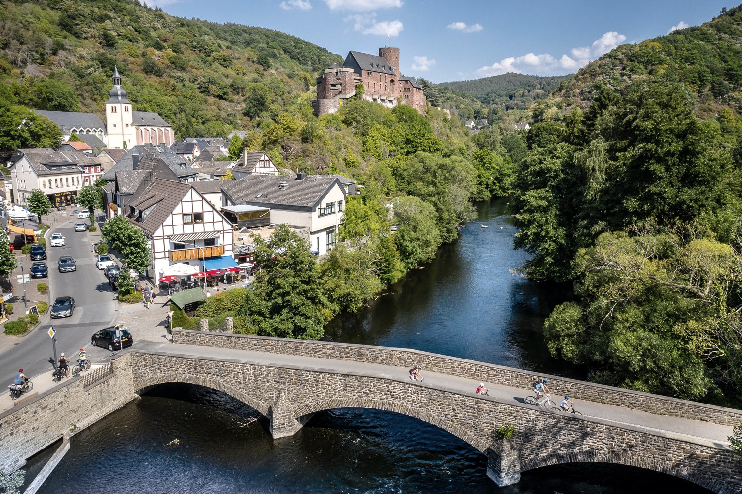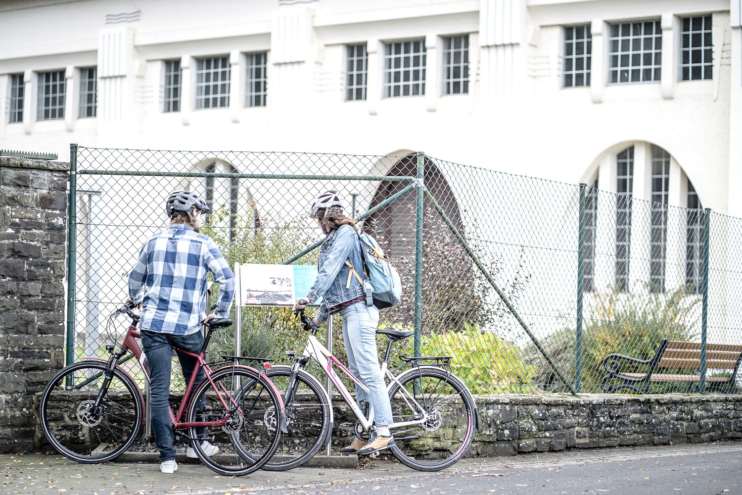 Nach etwa zwei Drittel der Strecke erreicht man das Jugendstikraftwerk Heimbach. Es wurde 1905 in Betrieb genommen und bezieht sein Wasser aus der Urfttalsperre über den Kermeterstollen, der 110 m oberhalb des Kraftwerkes in zwei Druckrohre übergeht. Das Elektrizitätswerk ist bis heute in Betrieb. Die ursprüngliche Ausrüstung mit acht Turbinen wurde 1975 durch zwei neue Maschinen mit höherem Wirkungsgrad ersetzt. Seitdem hat die Anlage eine installierte Leistung von 16.000 Kilowatt zur Abdeckung von Spitzenlast. Von den alten Maschinen sind noch einige an Ort und Stelle verblieben, da die neuen Stromerzeuger deutlich weniger Platz beanspruchen.