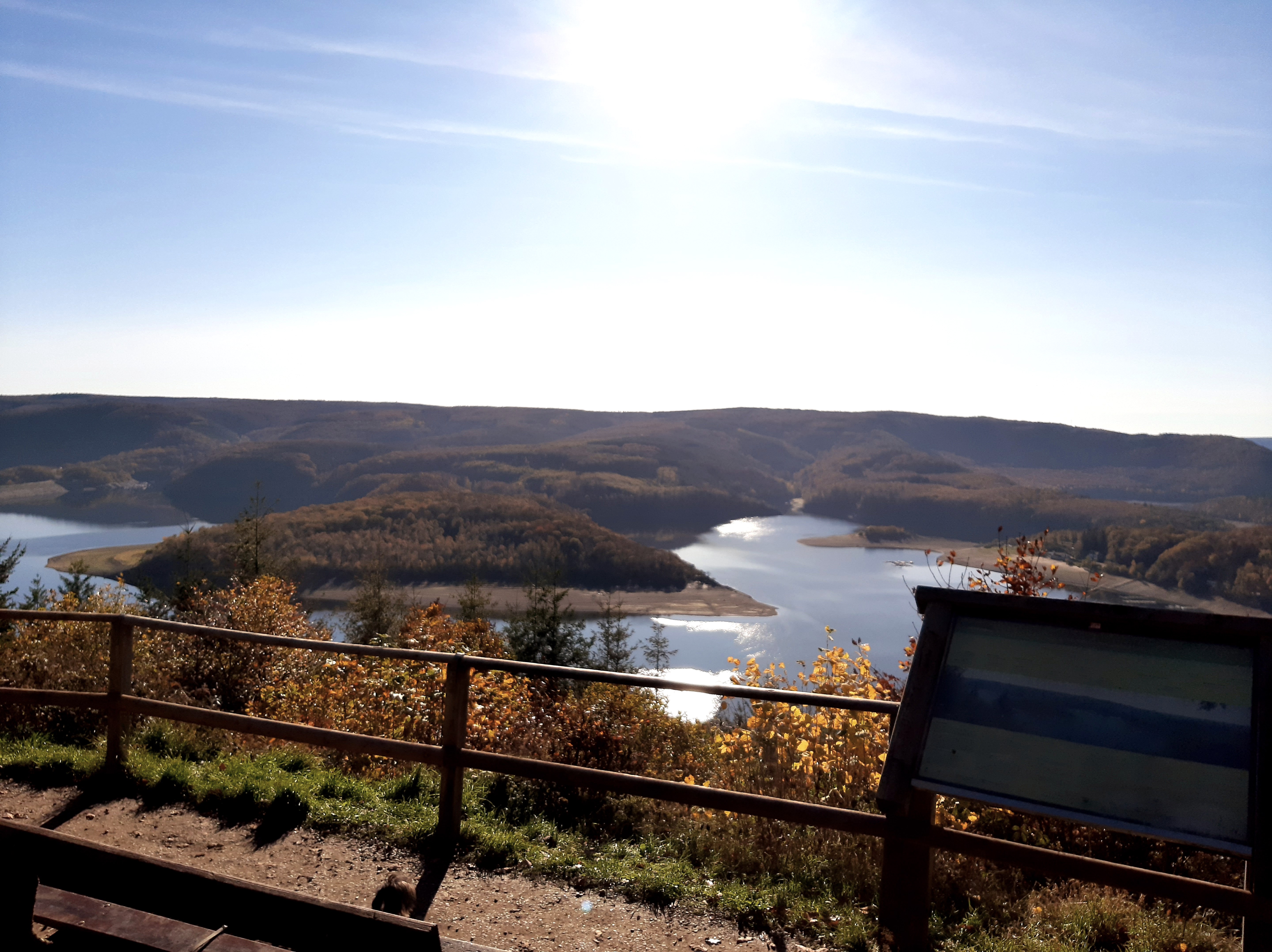 - Anschließend erreichst du den ersten Viewpoint „Schöne Aussicht“ mit Blick auf den blauen Rursee und seine Liebesinsel. Wenig später erwartet dich die nächste einmalige Panoramaaussicht auf der Hubertushöhe. Tipp: Vergiss nicht, an beiden Aussichtspunkten ein paar Gruppenfotos zu schießen.