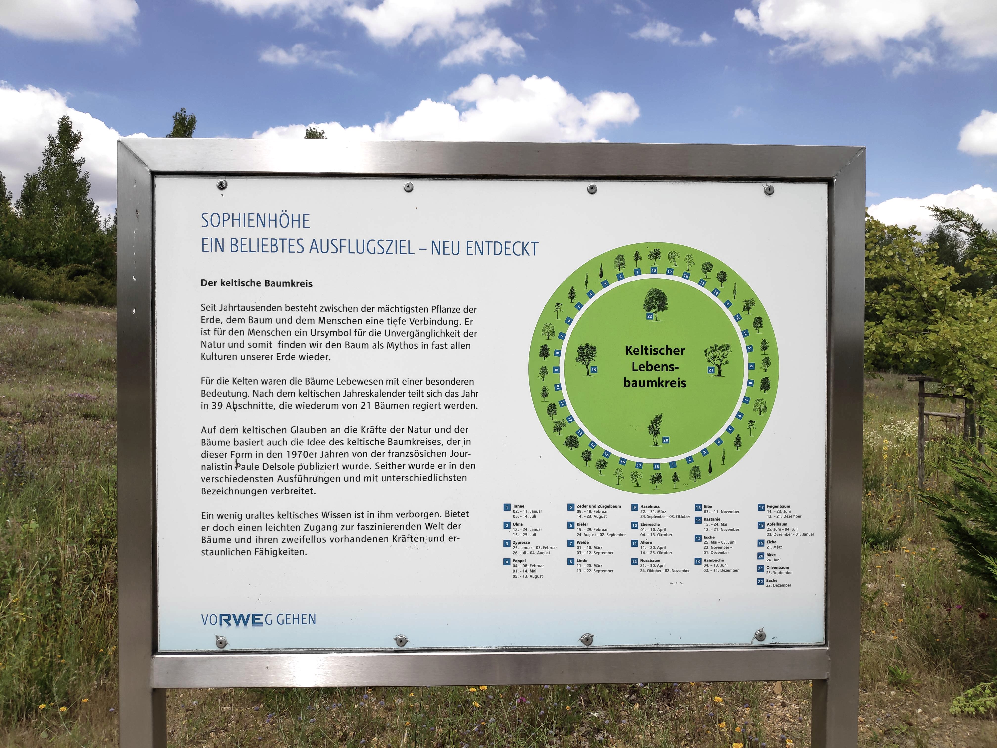 Die Sophienhöhe ist durch den Tagebau entstanden. Auf dieser ehemaligen Abraumhalde befindet sich heute ein gut ausgebautes Wander- und Radewegenetz, das sowohl zu gemütlichen Spaziergängen als auch zu längeren und anspruchsvolleren Wander- und Radtouren einlädt. Auf der Route zu den Highlights der Sophienhöhe liegen der Römerturm, das Höller Horn, der Lebensbaumkreis, das Wetter-Radar und der Stein-Kompass.
