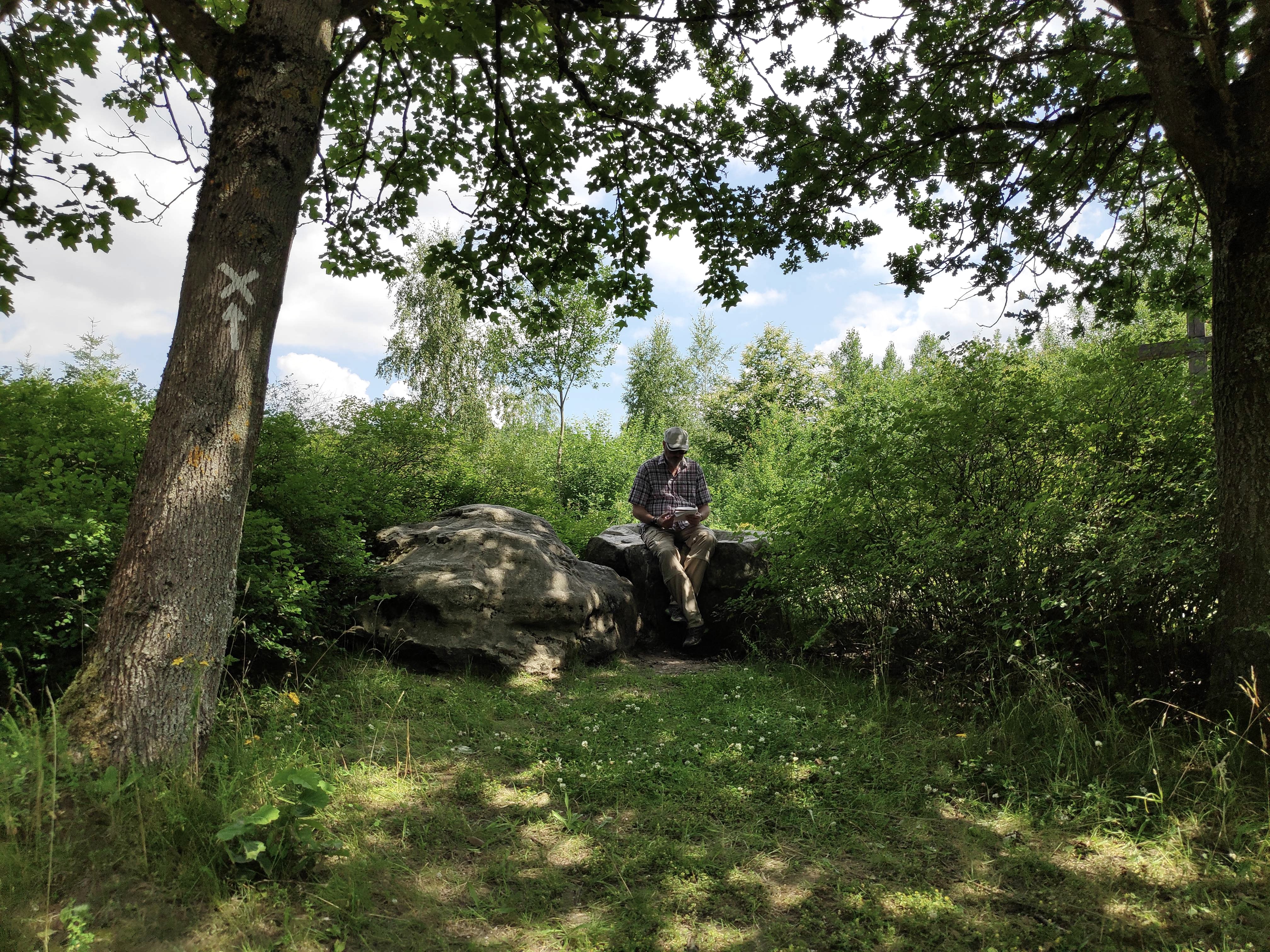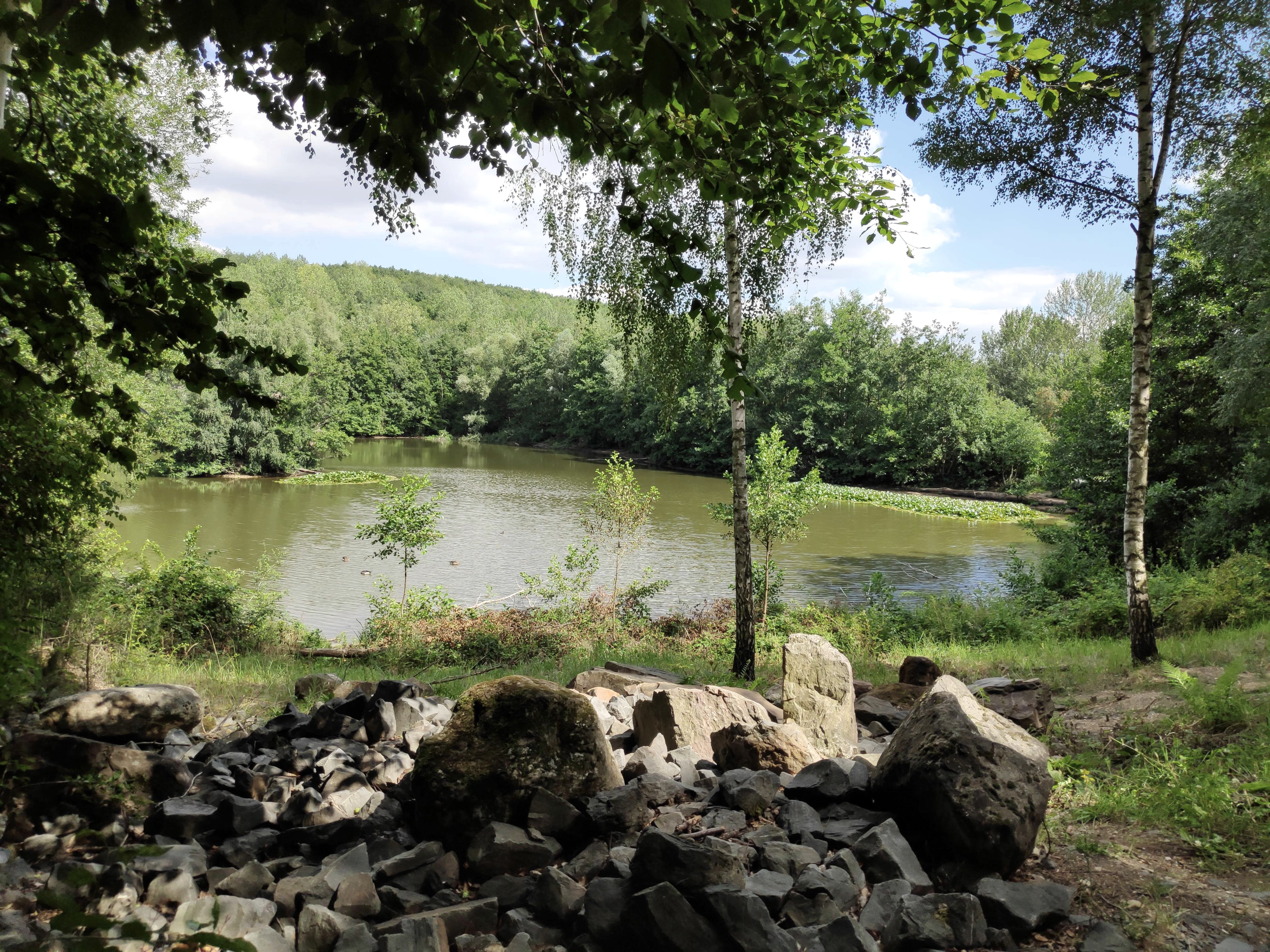Hier biegen wir links ab und folgen dem Weg bis zum "Keltischen Lebensbaumkreis", einem weiteren Highlight auf unserer Wanderung. Eine Tafel erläutert, dass die Kelten Bäume als Lebewesen mit einer besonderen Bedeutung betrachteten. Der "Keltische Lebensbaumkreis" ist dem keltischen Jahreskalender nachempfunden, der das Jahr in 39 Abschnitte aufteilt, denen 21 Bäume zugeordnet sind. Wir verlassen den "Keltischen Lebensbaumkreis" in Fortsetzung der Wegerichtung aus der wir gekommen sind. Unterwegs passieren wir das Wetter-Radar und errreichen kurz darauf den Steinkompass mit einer Schutzhütte. Mineralien, die man beim Tagebau gefördert hat, markieren die Himmelsrichtungen des Steinkompass. Wir durchqueren den Steinkompass und wandern weiter geradeaus. Wir folgen der Linksbiegung des Weges bergab und halten uns an der nächsten Kreuzung geradeaus (Wegezeichen H). Vorbei am Rettungspunkt 6 erreichen wir den Inselsee mit einem Rastplatz, der zum Verweilen einlädt.