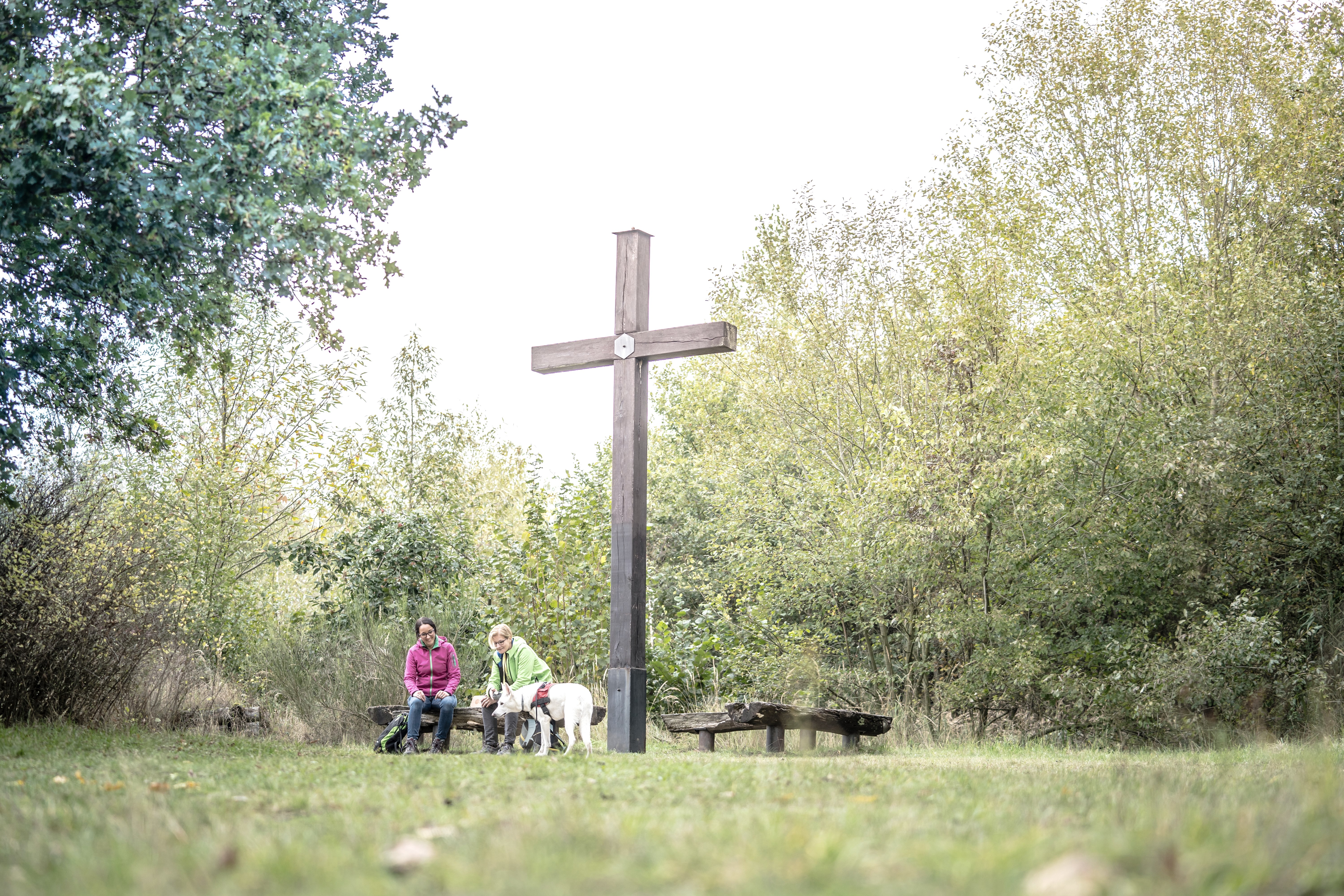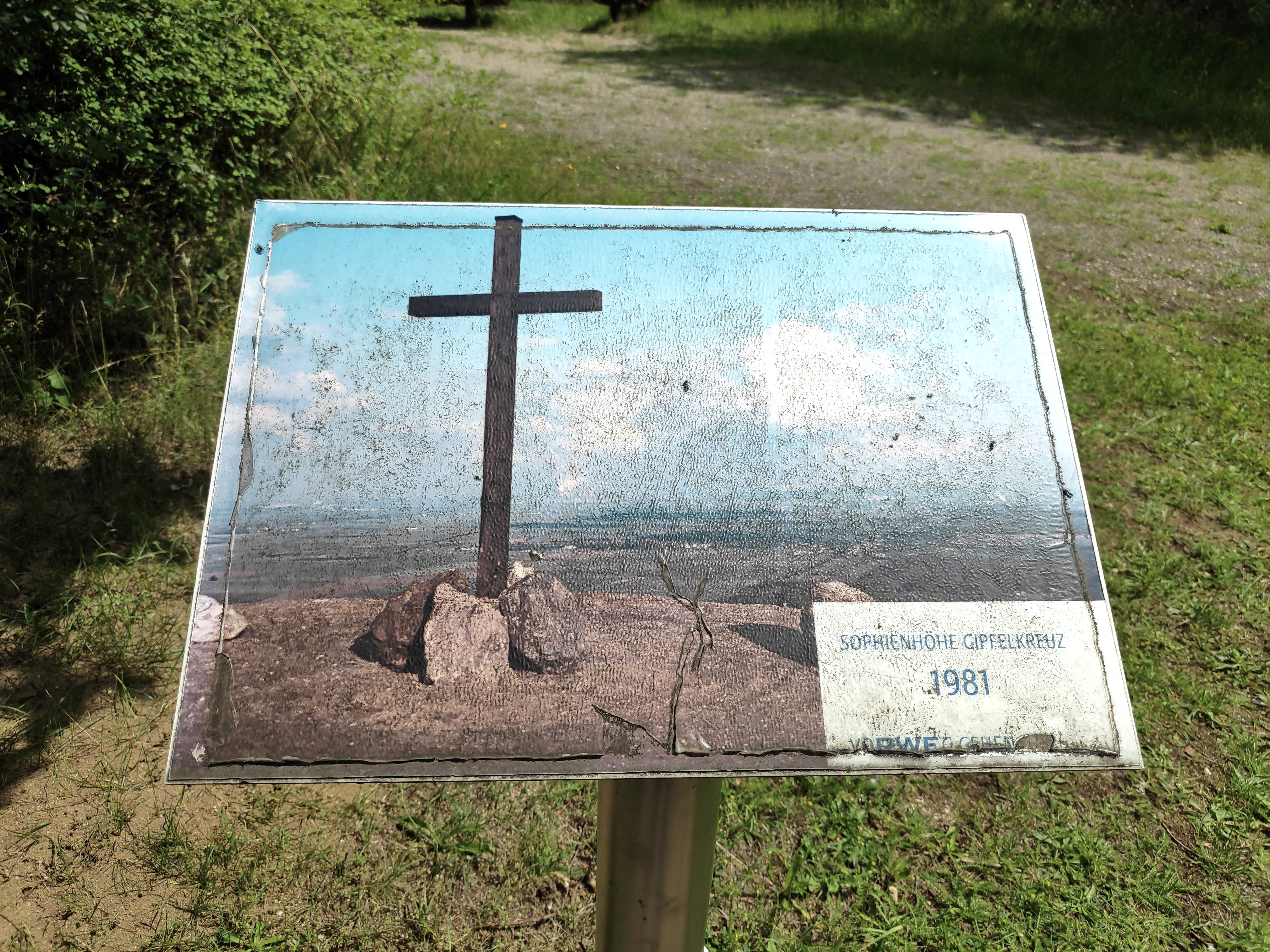 Vom Wanderparkplatz Sophienhöhe kommend, orientieren wir uns zunächst links und dann sofort wieder rechts und folgen den Wanderzeichen A und H. Am Rettungspunkt 10 gehen wir rechts und folgen dem Weg und weiter den Wegezeichen A und H bergan. Am Aussichtspunkt auf das Kraftwerk Weisweiler biegen wir links ab und folgen dem Wanderzeichen H bis zur nächsten Abzweigung. Hier verlassen wir den Wanderweg H und folgen dem Wegezeichen A geradeaus. Am Schild "Mammutwald" können wir entweder weiter geradeaus gehen oder einen kurzen Abstecher in den Wald machen. Der Pfad des Mammutwaldes trifft ein Stück weiter oben wieder auf unseren Weg, an dessen Ende das Gipfelkreuz und eine Schutzhütte stehen. Vergleicht man das Foto mit dem Gipfelkreuz aus dem Jahr 1981 mit den aktuellen Gegebenheiten, sieht man eindrucksvoll, wie sich die Natur entwickelt hat.