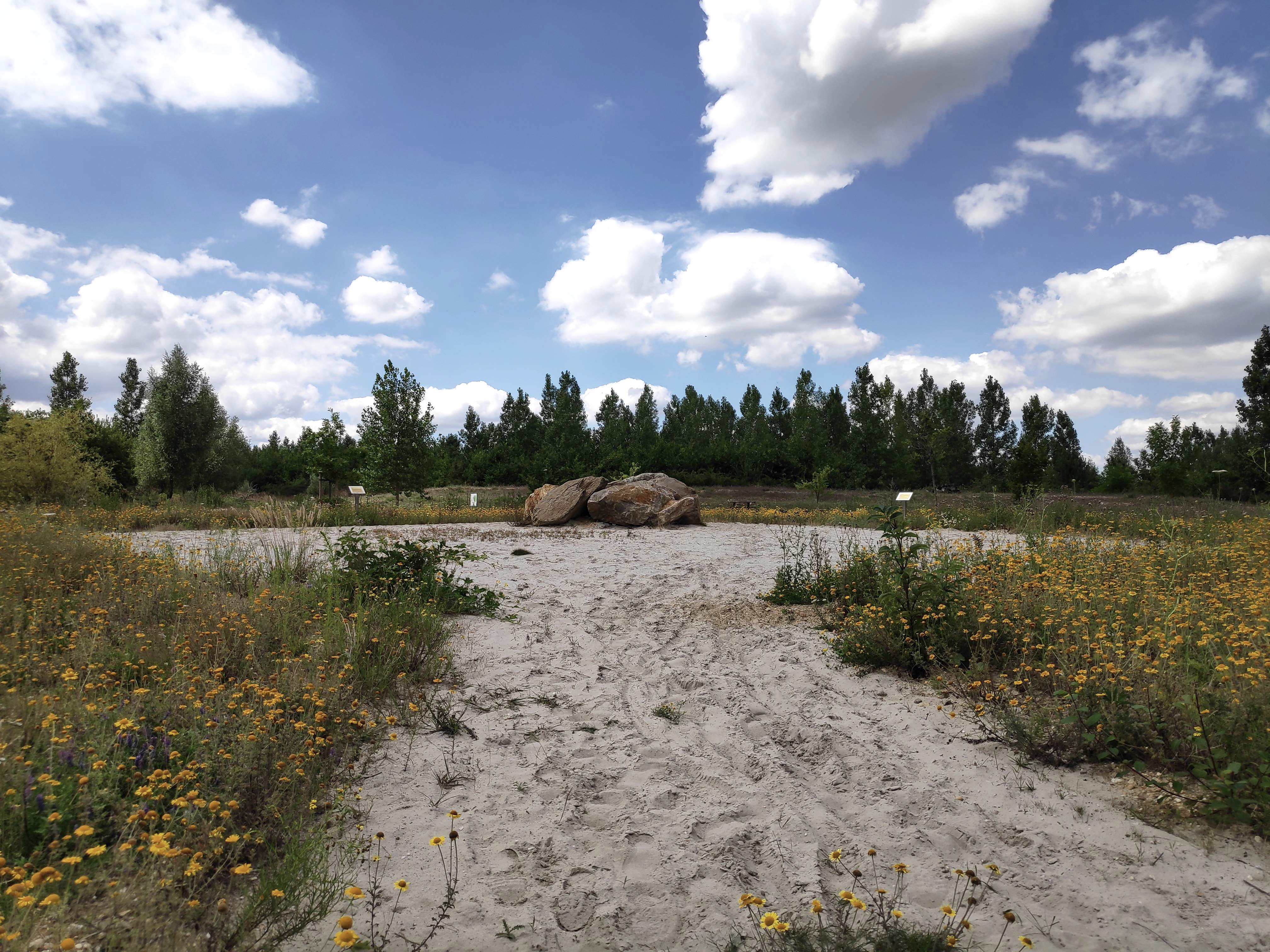 Die Anhöhe mit dem Römerturm verlassen wir über den Pfad bergab und biegen an dessen Ende rechts ab auf den breiten Weg und an der T-Kreuzung halten wir uns wieder rechts. Am Rettungspunkt 39 machen wir einen Abstecher hinauf zum Höller Horn, d.h. wir biegen rechts ab (Wegezeichen F und D) und nach wenigen Schritten links ab in ein sandiges Pfädchen, das uns auf einen Sandhügel mit Pioniergewächsen bringt (Höller Horn). Zur Erforschung der natürlichen Ausbreitung von Fauna und Flora wurde diese Anhöhe nicht rekultiviert, sondern lediglich nährstoffarmer Sand sowie toniges Material und Kies verkippt. Der Turm, den eine Wetterfahne mit dem Schriftzug "Monte Sophia" (wie die Sophienhöhe genannt wird) ziert, ist einem Förderturm einer Erzgrube aus dem Spätmittelalter nachempfunden.