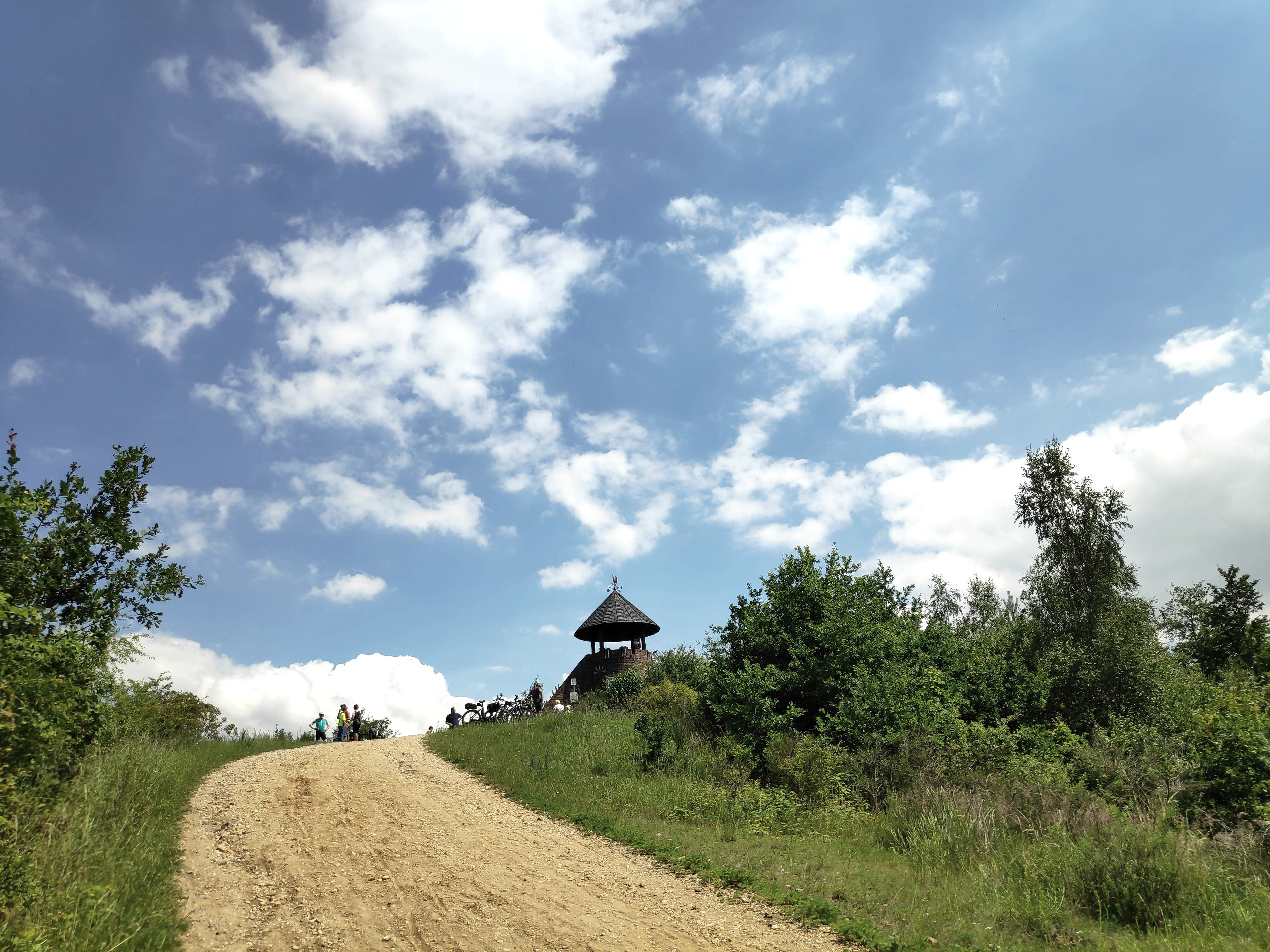 Beim Gipfelkreuz halten wir uns links und folgen der Wegweisung zum Römerturm. An der nächsten Kreuzung gehen wir weiter geradeaus und folgen dem Weg, der eine Rechtskurve macht. An der nächsten Kreuzung biegen wir links ab, orientieren uns umgehend rechts und steigen den Weg bergan zum Römerturm. Dieser Aussichtsturm ist einem römischen Wachturm nachempfunden und bietet einen schönen Rundumblick. Tafeln erläutern die Blickziele.